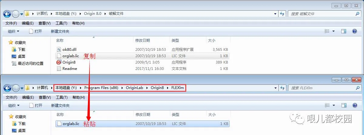 20.再次打开“Origin 8.0\破解文件”文件夹,将“orglab.lic”文件复制粘贴到安装路径 X:\Program Files (x86)\OriginLab\Origin8 下的“FLEXlm”文件夹,其中“X”是你安装软件的磁盘号,如下图所示
