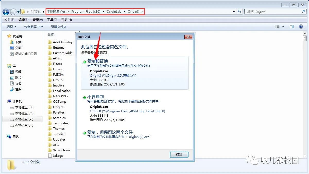 22.打开安装路径(默认为 C:\Program Files (x86)\OriginLab\Origin8)文件夹,粘贴刚刚复制的文件“Origin8.exe”,然后点击“复制和替换”