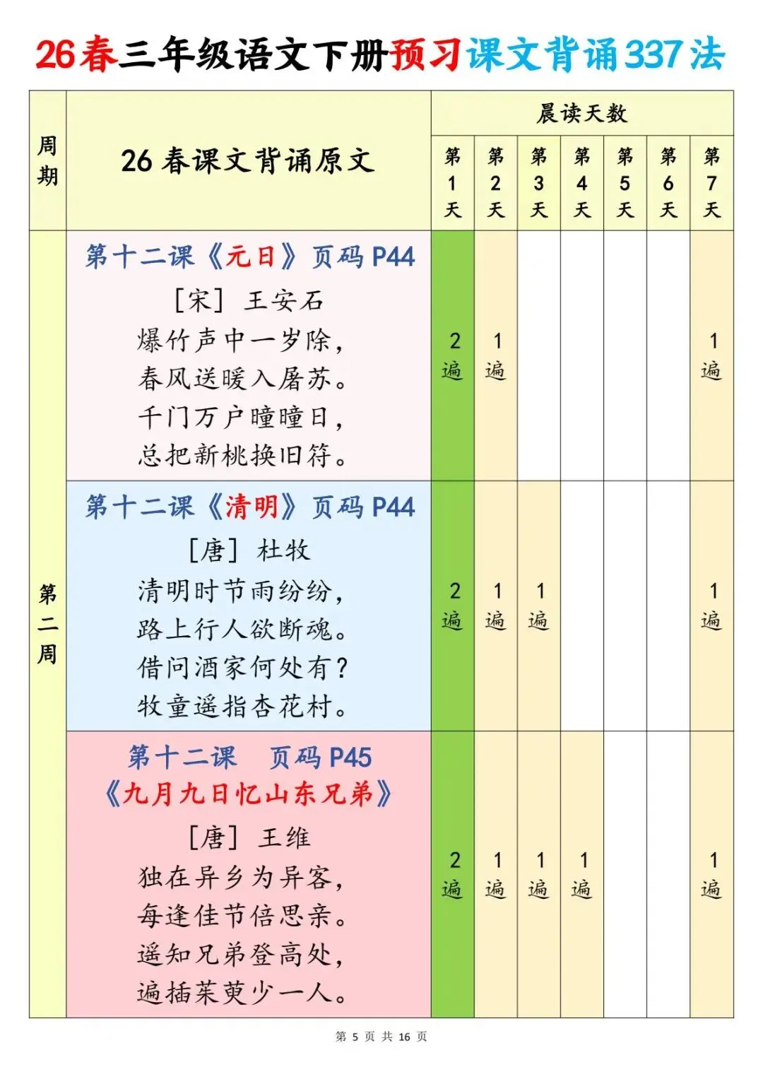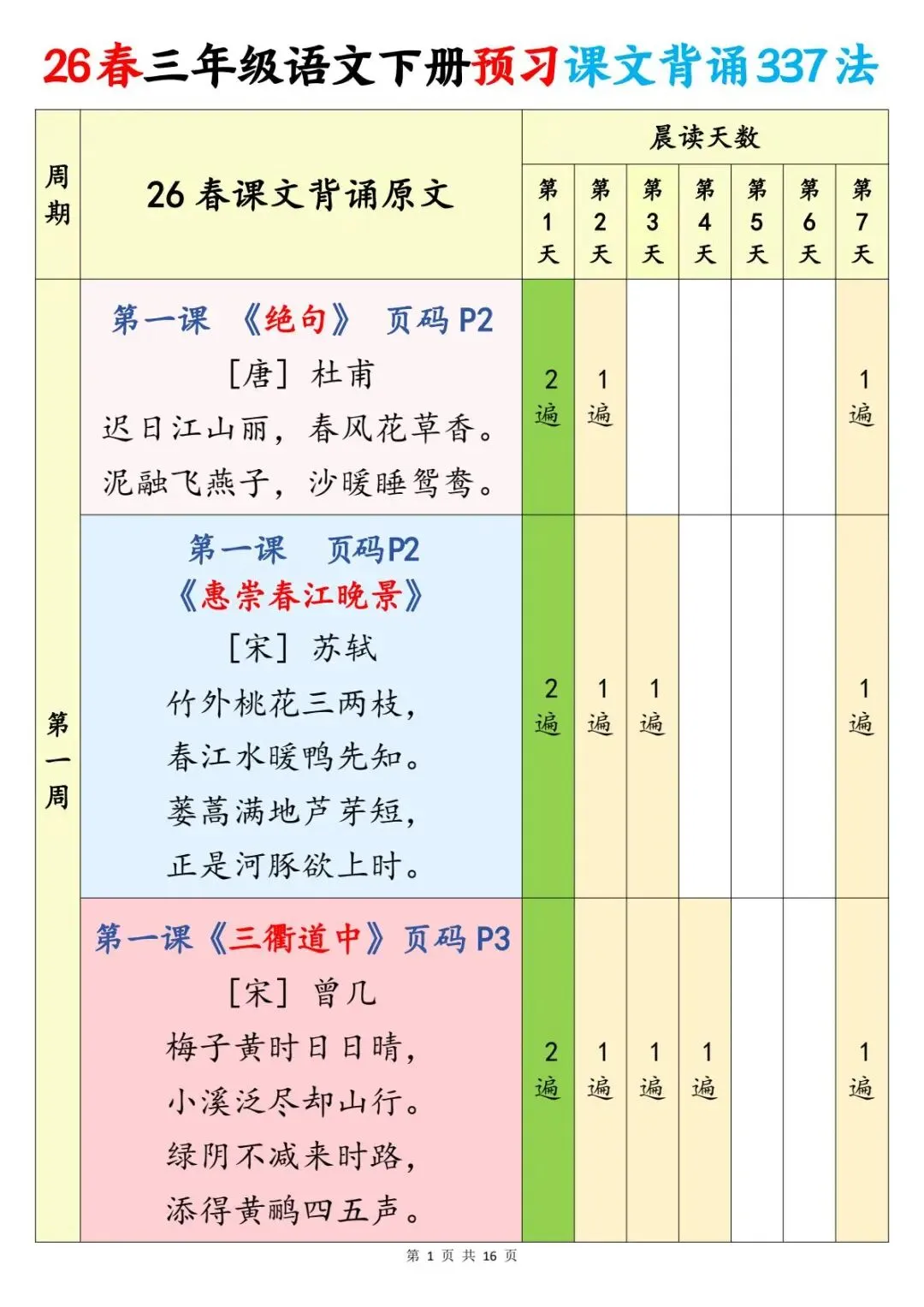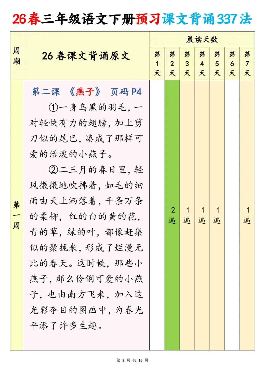 三年级(下)语文 预习课文背诵337法