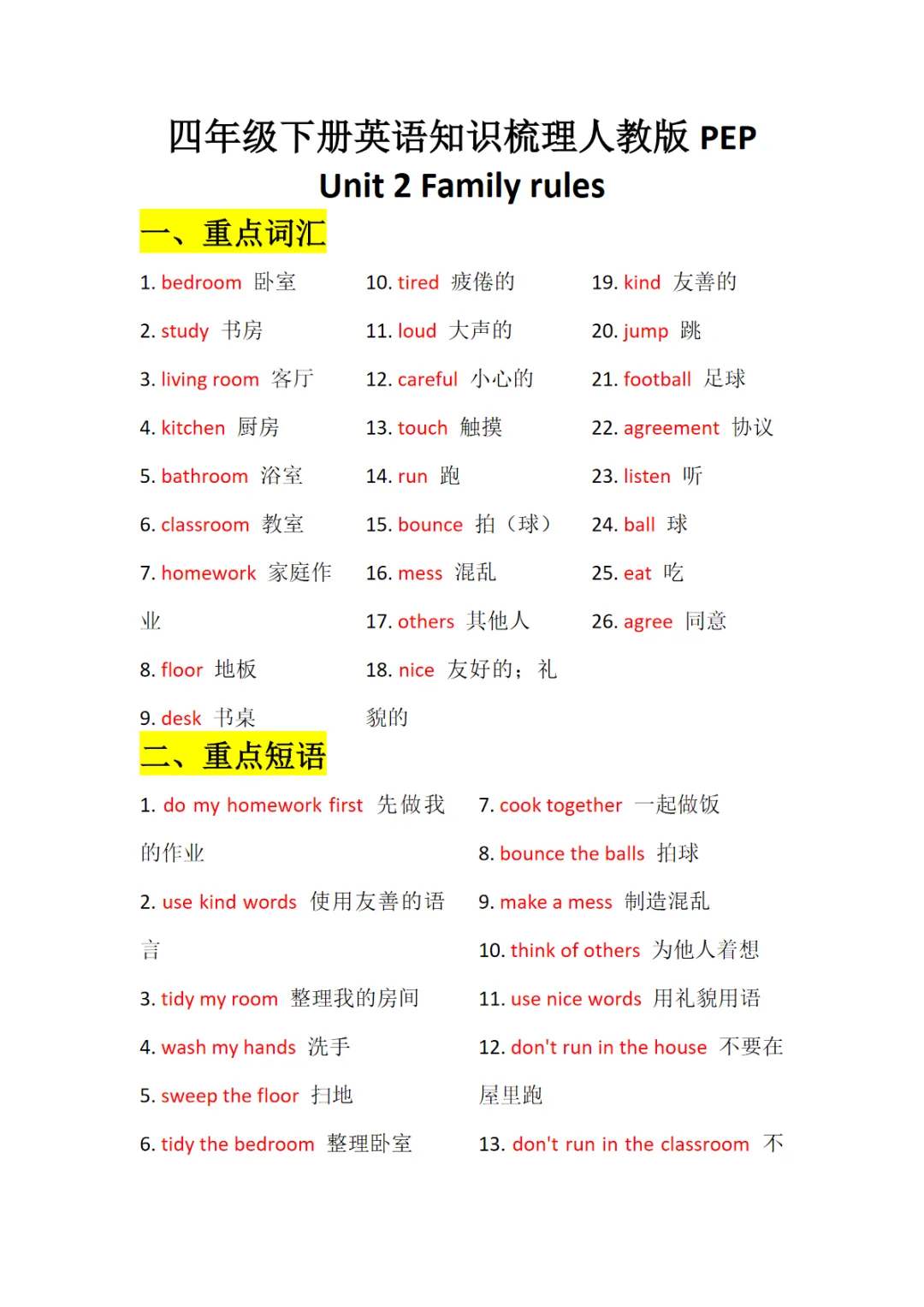【免费下载】四年级(下)英语 Unit 2 知识梳理+默写单《人教版PEP》,PDF电子版,共15页,可打印