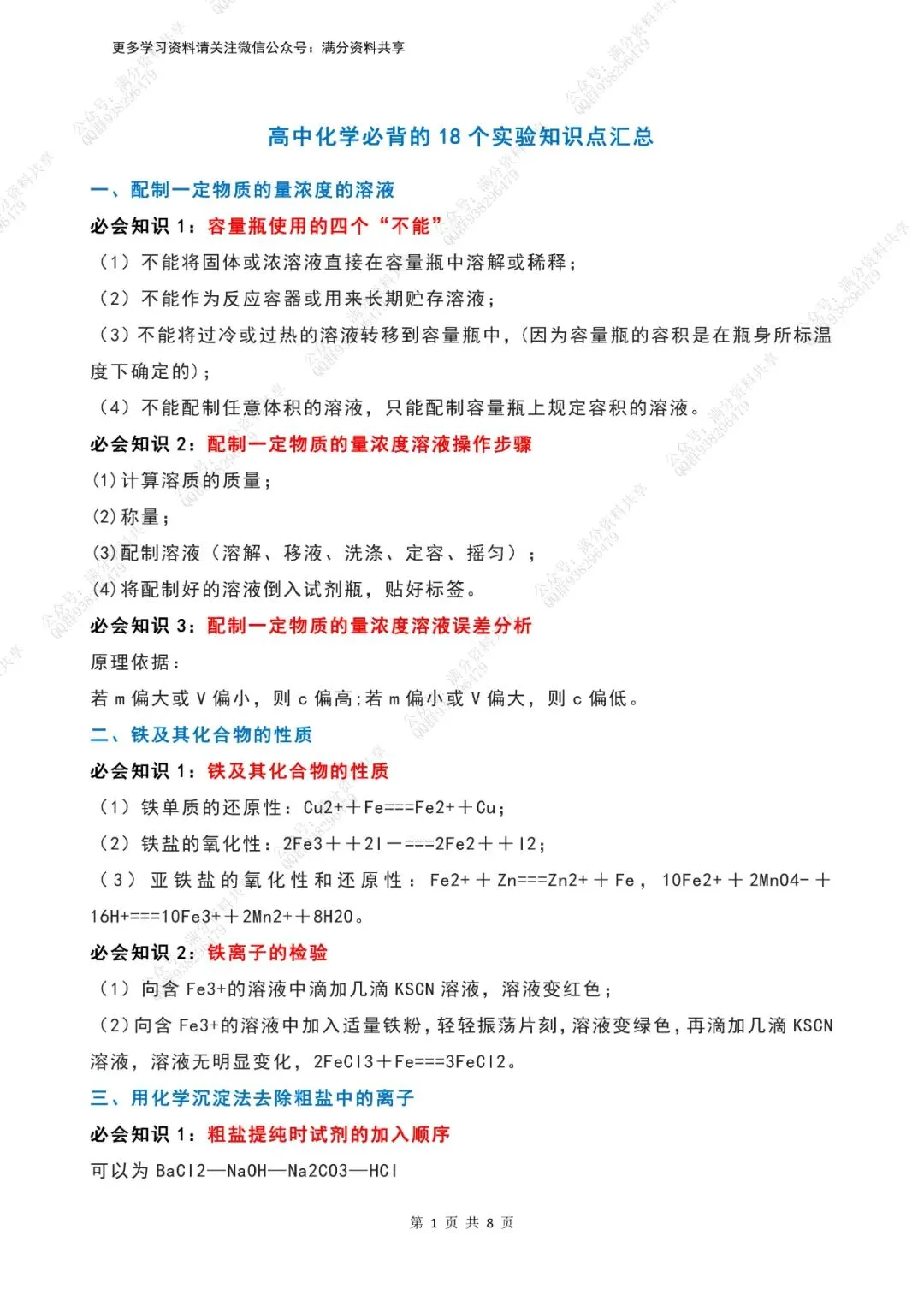 高中化学必背的18个实验知识点汇总(pdf分享) 点击图片可观看高清版,文末有获取打印版方式 领取完整电子版: ①:点一点右下角的“赞”和“在看”,感谢! ②:点击“关注”回复“高中资料”获取资料 点击下方“公众号”关注,可以进入主页哦!