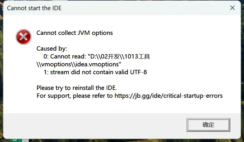 自查:需要按照提示把 pycharm.vmoptions,用记事本打开,然后另存为时,选择编码为:UTF-8,重新保存。