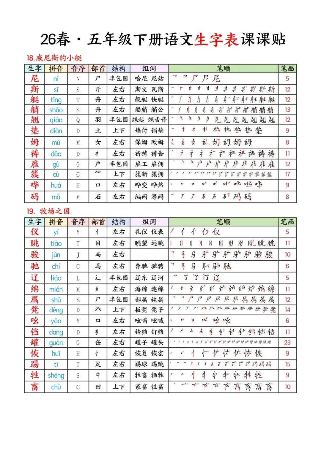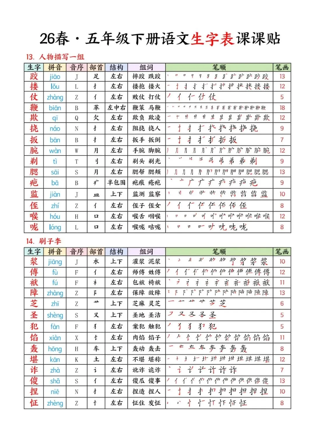 26春五年级下册语文生字课课贴 完整高清电子版可打印