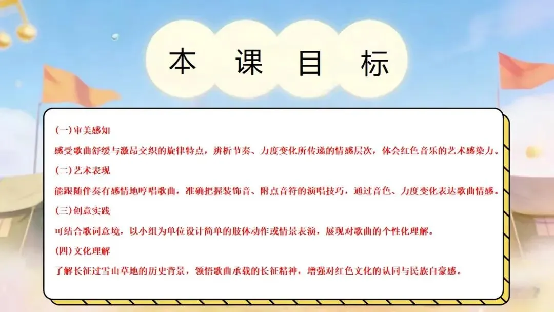 2.理解红色音乐的文化内涵,将历史认知转化为审美体验与情感共鸣。