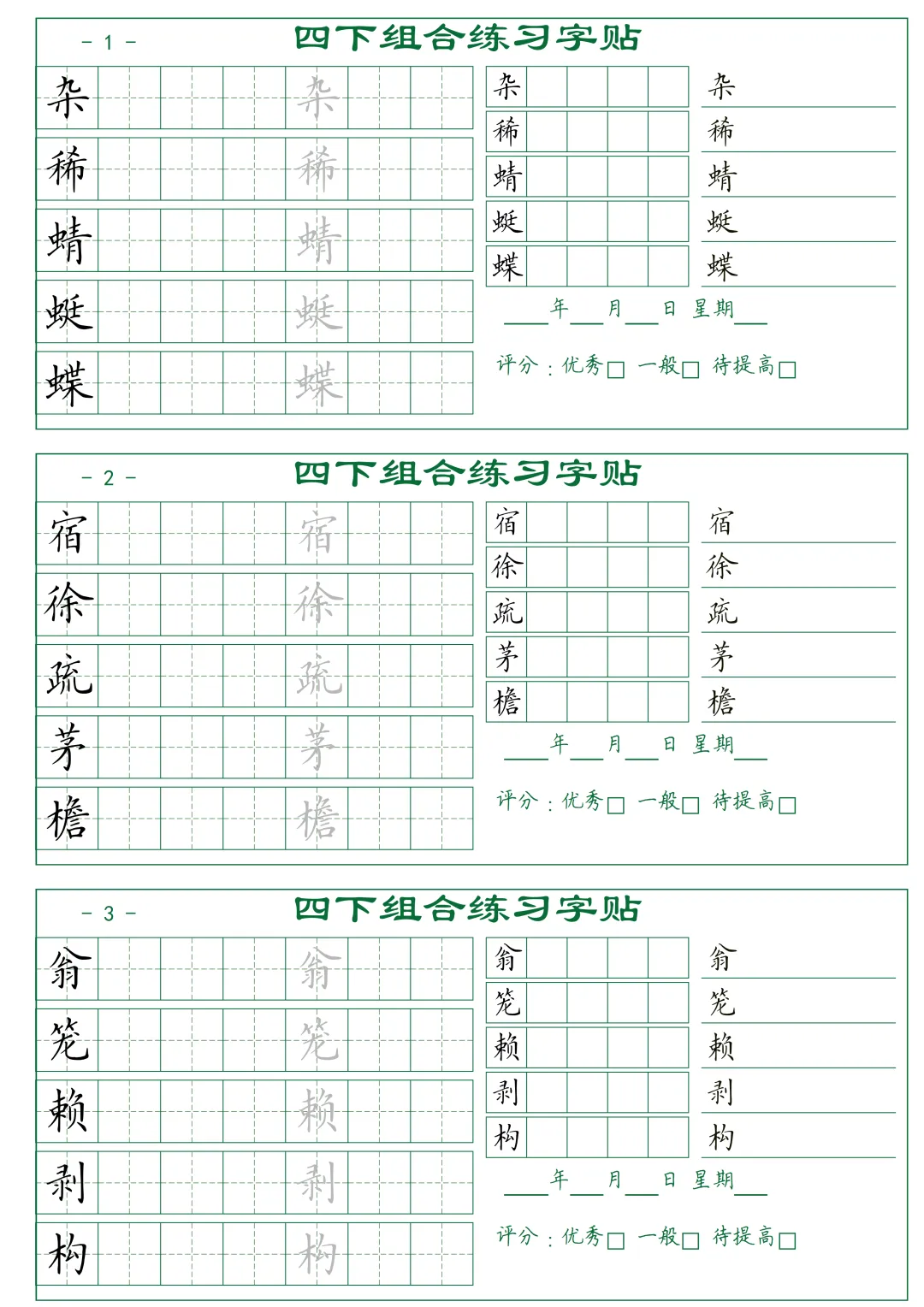 【免费下载】四年级(下)语文 组合练习字帖17页,PDF电子版,共17页,可打印
