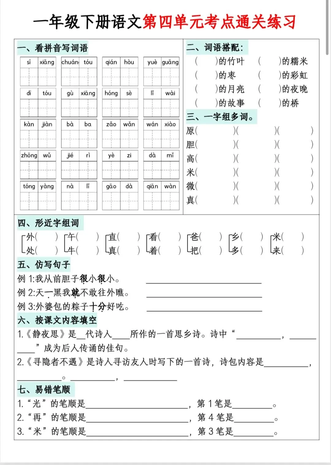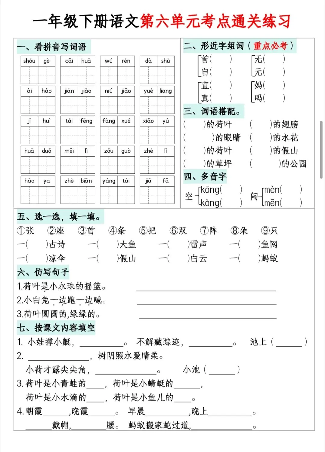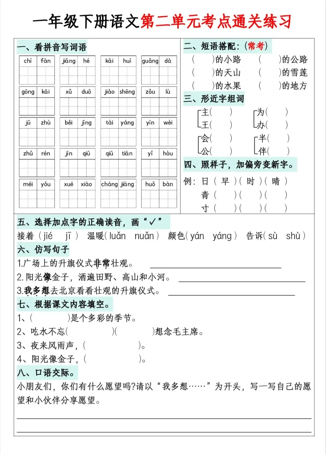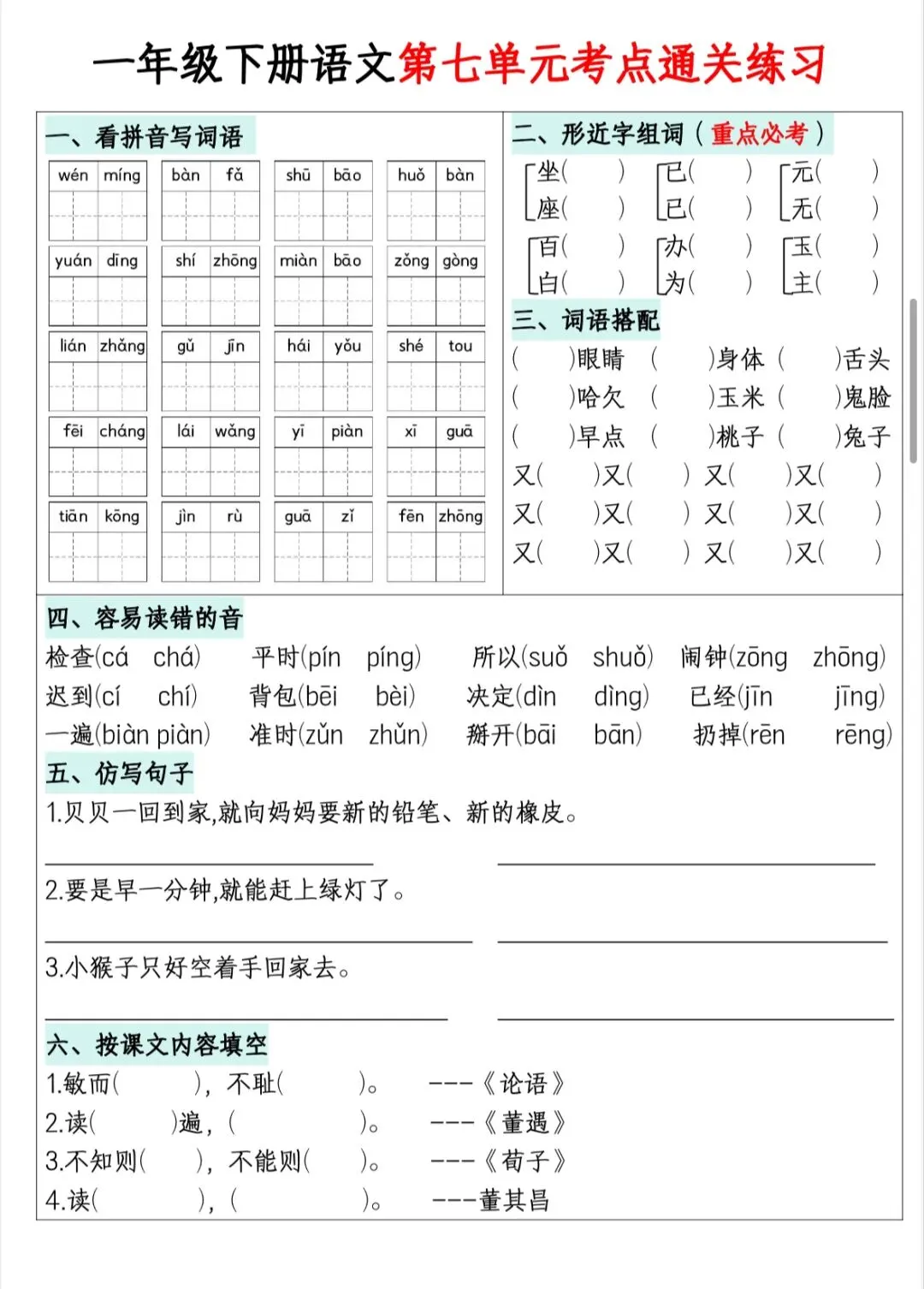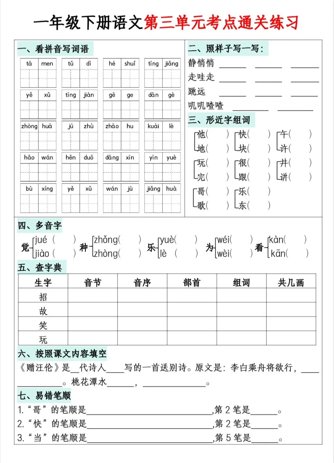 一年级下册语文基础全通关默写单(电子版PDF),电子版可打印
