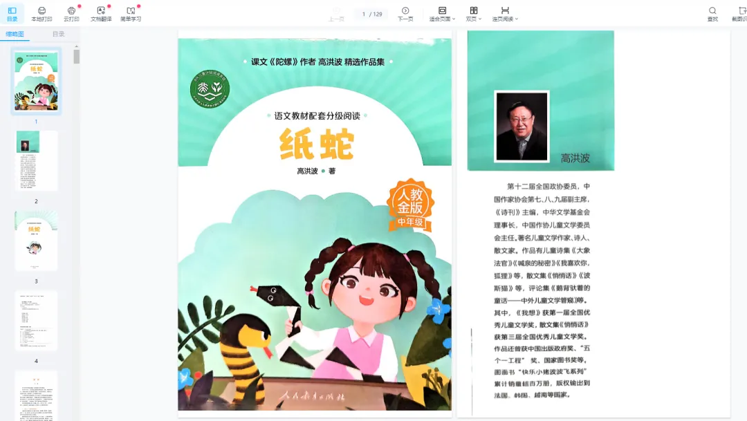 《纸蛇》是儿童文学作家高洪波创作的散文童话集,属于“语文教材配套分级阅读”丛书,适合小学中高年级学生阅读。书中收录了作者四十余年的创作精华,包括《竹蜻蜓》《翠绿色的歌》《剪蝈笼》等经典篇目,以童真视角书写童年游戏、自然美景与校园生活,语言充满诗意与温情。书后设有“作家说”专栏,揭秘作品创作故事并提供文学赏析方法,既是理解课文的辅助工具,也是提升阅读能力的实用资源。该书通过文字连接课堂与课外,让读者在感受文学之美的同时,重温童年的温暖与成长记忆。