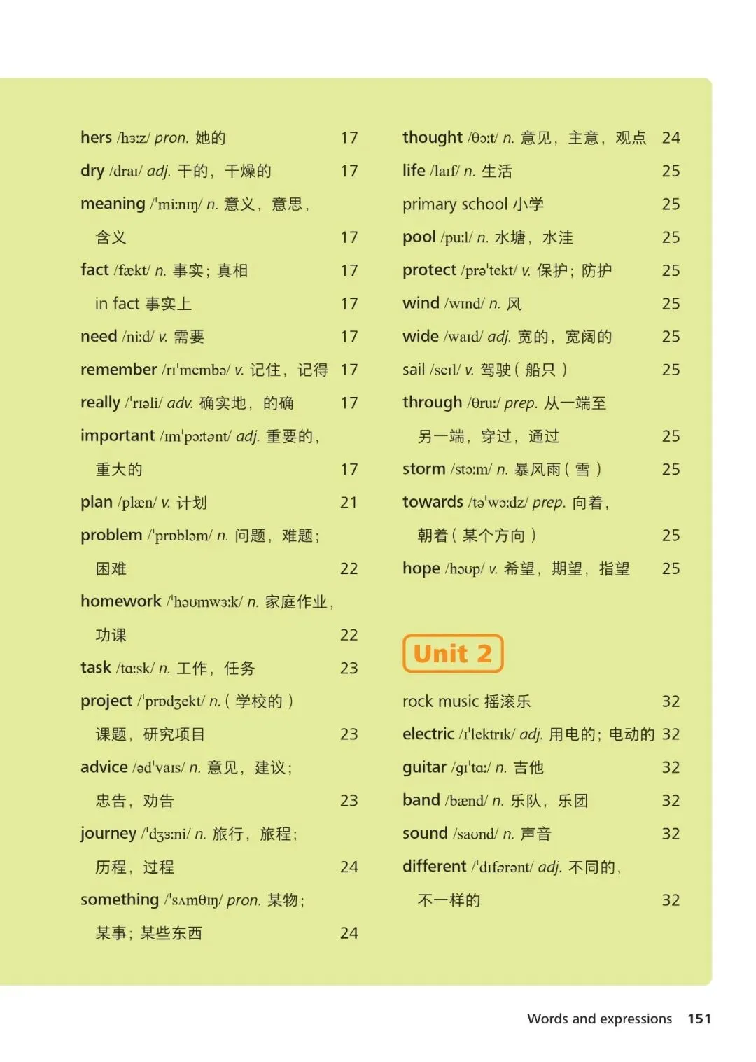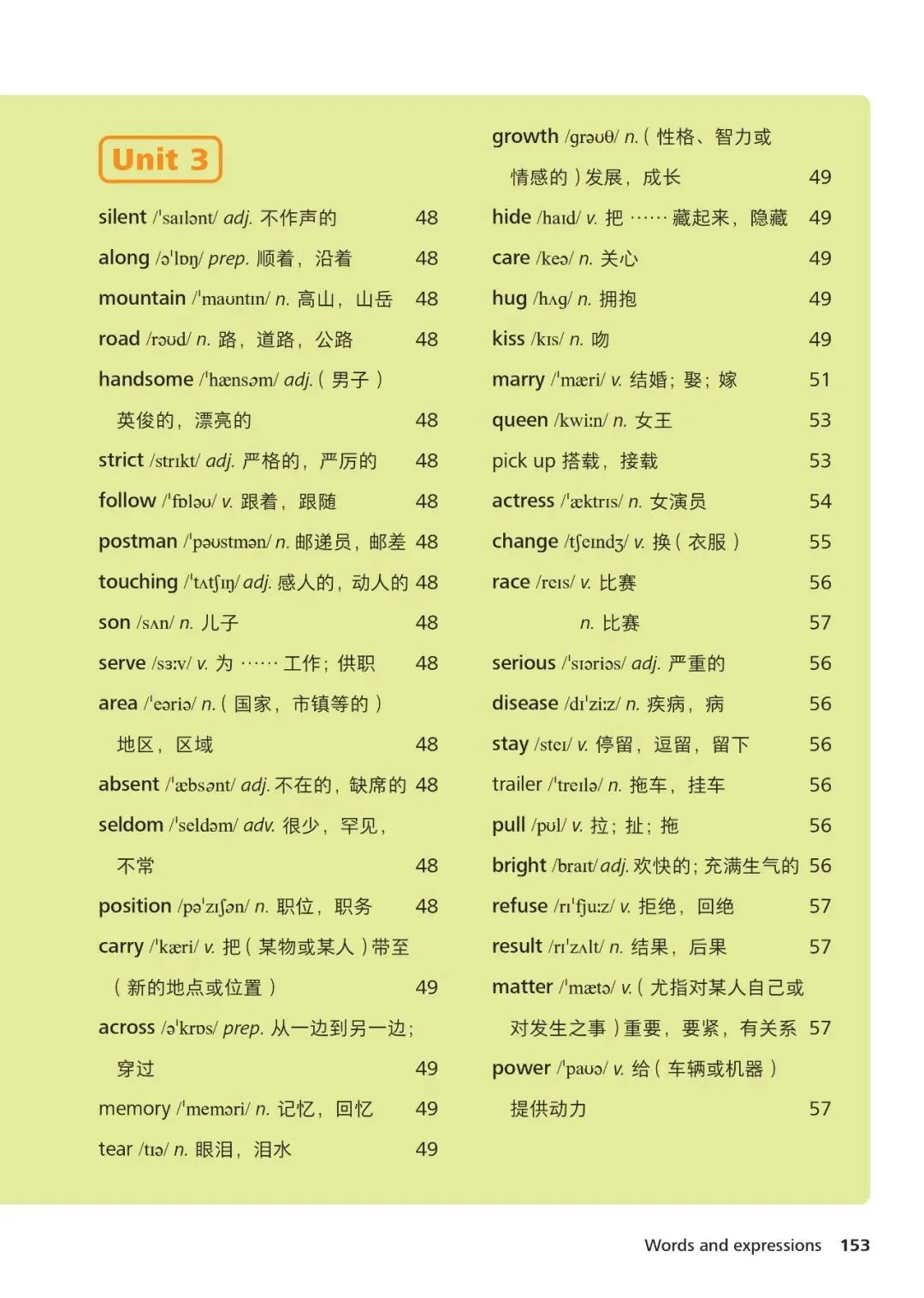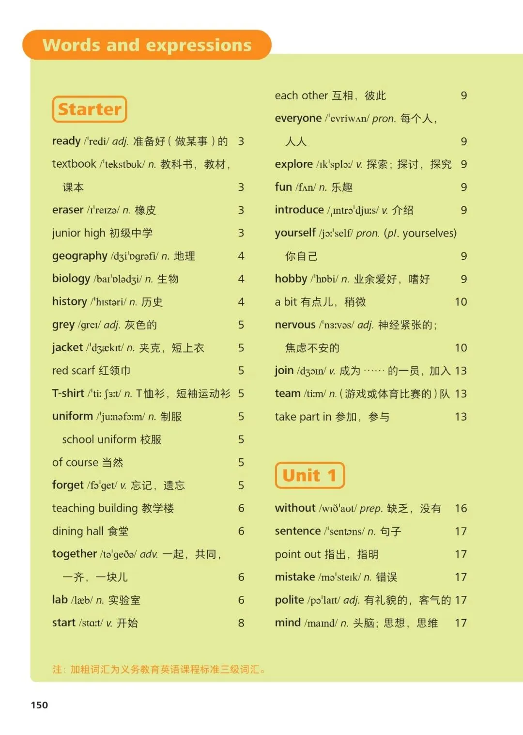 1、hello /həˈləʊ/ interj. 你好2、name /neɪm/ n. 名字3、student /ˈstjuːdənt/ n. 学生4、teacher /ˈtiːtʃə/ n. 老师5、school /skuːl/ n. 学校6、class /klɑːs/ n. 班级7、friend /frend/ n. 朋友8、family /ˈfæməli/ n. 家庭9、father /ˈfɑːðə/ n. 父亲10、mother /ˈmʌðə/ n. 母亲11、brother /ˈbrʌðə/ n. 兄弟12、sister /ˈsɪstə/ n. 姐妹13、book /bʊk/ n. 书14、pen /pen/ n. 钢笔15、bag /bæɡ/ n. 书包16、desk /desk/ n. 书桌17、room /ruːm/ n. 房间18、computer /kəmˈpjuːtə/ n. 电脑19、map /mæp/ n. 地图20、city /ˈsɪti/ n. 城市21、country /ˈkʌntri/ n. 国家22、English /ˈɪŋɡlɪʃ/ n./adj. 英语;英国的23、age /eɪdʒ/ n. 年龄24、number /ˈnʌmbə/ n. 数字25、where /weə/ adv. 哪里26、what /wɒt/ pron. 什么27、how /haʊ/ adv. 如何28、this /ðɪs/ pron. 这个29、that /ðæt/ pron. 那个30、with /wɪð/ prep. 和