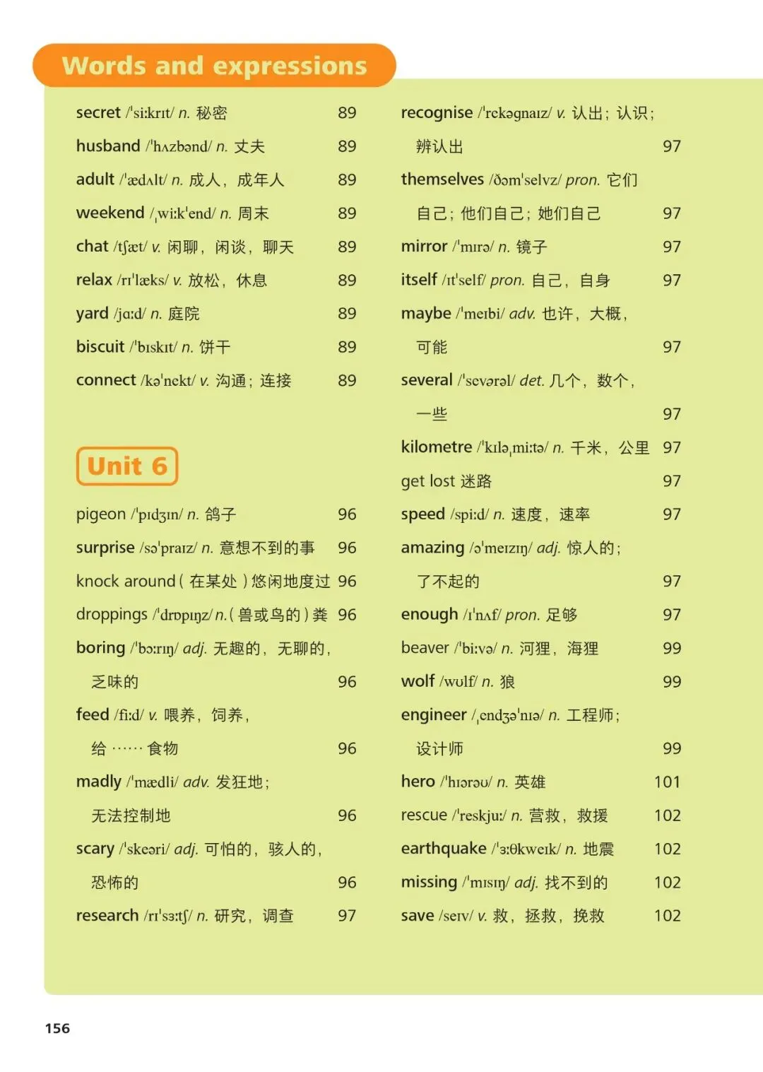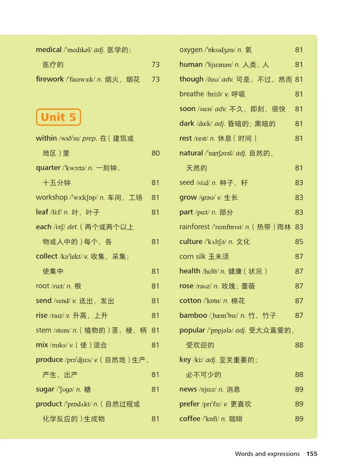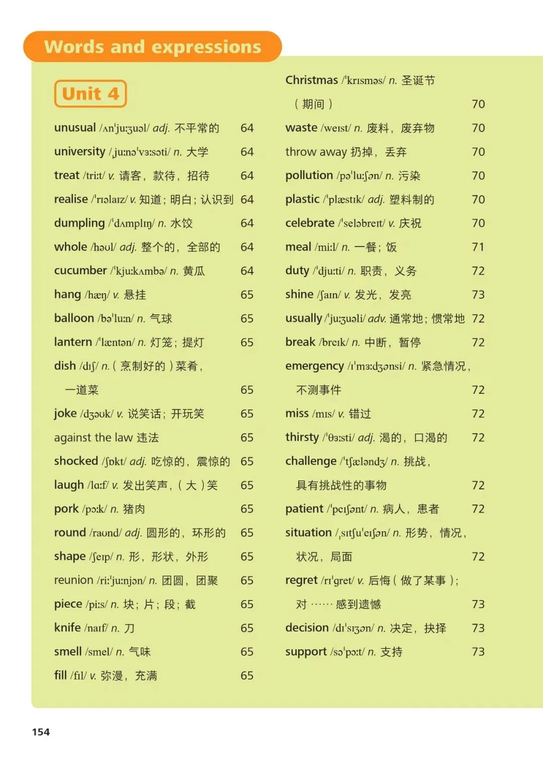 1、hello /həˈləʊ/ interj. 你好2、name /neɪm/ n. 名字3、student /ˈstjuːdənt/ n. 学生4、teacher /ˈtiːtʃə/ n. 老师5、school /skuːl/ n. 学校6、class /klɑːs/ n. 班级7、friend /frend/ n. 朋友8、family /ˈfæməli/ n. 家庭9、father /ˈfɑːðə/ n. 父亲10、mother /ˈmʌðə/ n. 母亲11、brother /ˈbrʌðə/ n. 兄弟12、sister /ˈsɪstə/ n. 姐妹13、book /bʊk/ n. 书14、pen /pen/ n. 钢笔15、bag /bæɡ/ n. 书包16、desk /desk/ n. 书桌17、room /ruːm/ n. 房间18、computer /kəmˈpjuːtə/ n. 电脑19、map /mæp/ n. 地图20、city /ˈsɪti/ n. 城市21、country /ˈkʌntri/ n. 国家22、English /ˈɪŋɡlɪʃ/ n./adj. 英语;英国的23、age /eɪdʒ/ n. 年龄24、number /ˈnʌmbə/ n. 数字25、where /weə/ adv. 哪里26、what /wɒt/ pron. 什么27、how /haʊ/ adv. 如何28、this /ðɪs/ pron. 这个29、that /ðæt/ pron. 那个30、with /wɪð/ prep. 和
