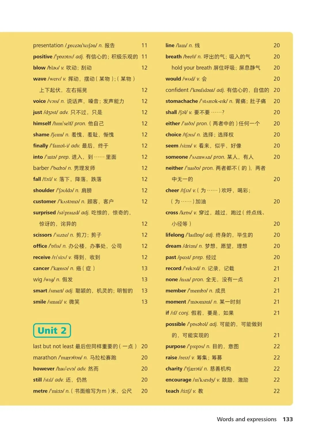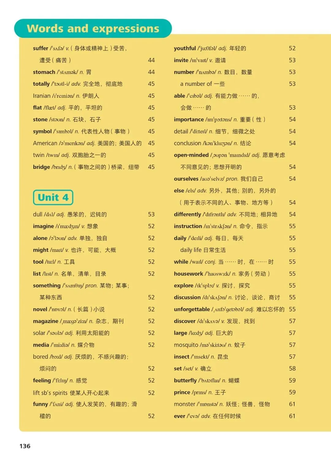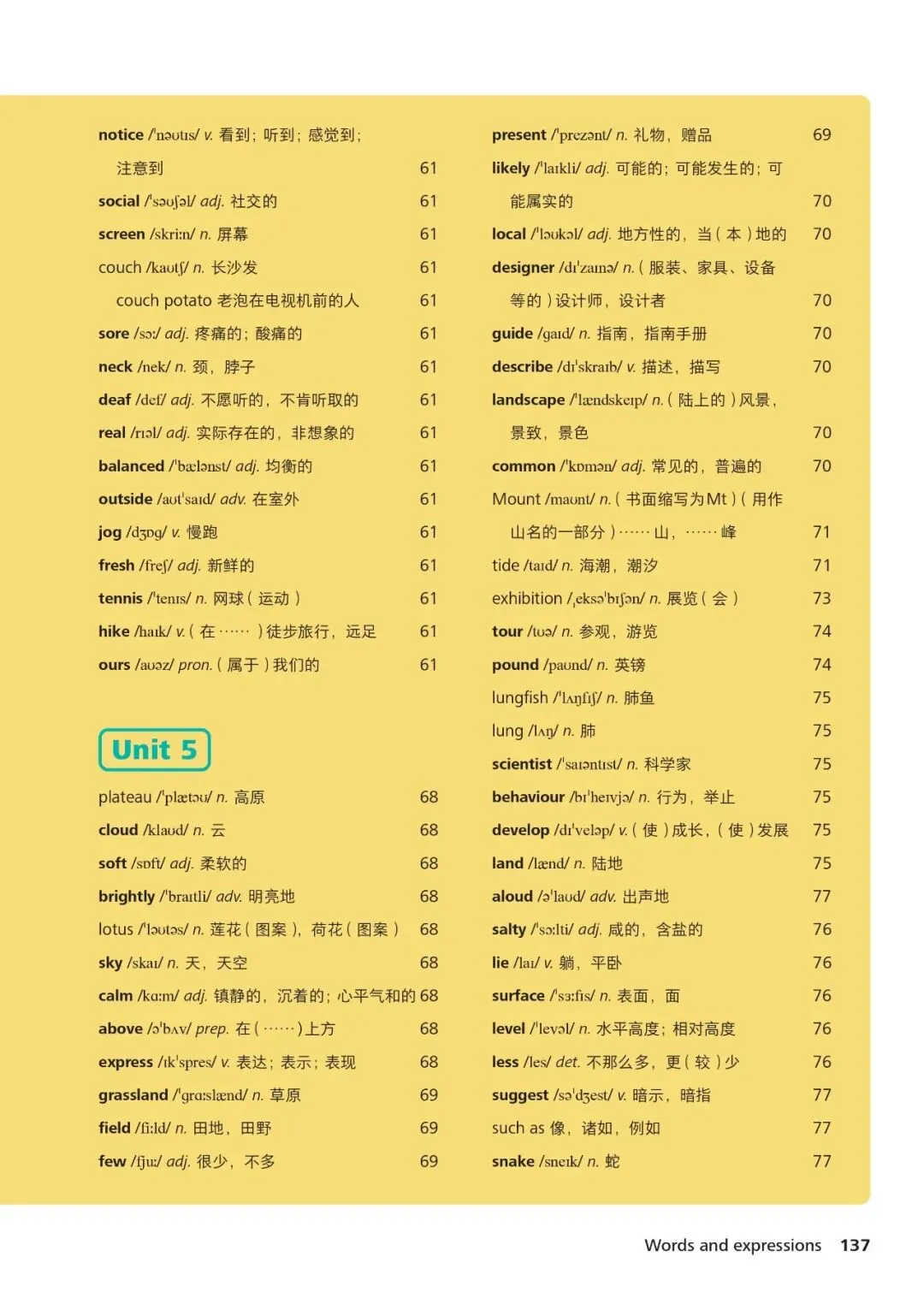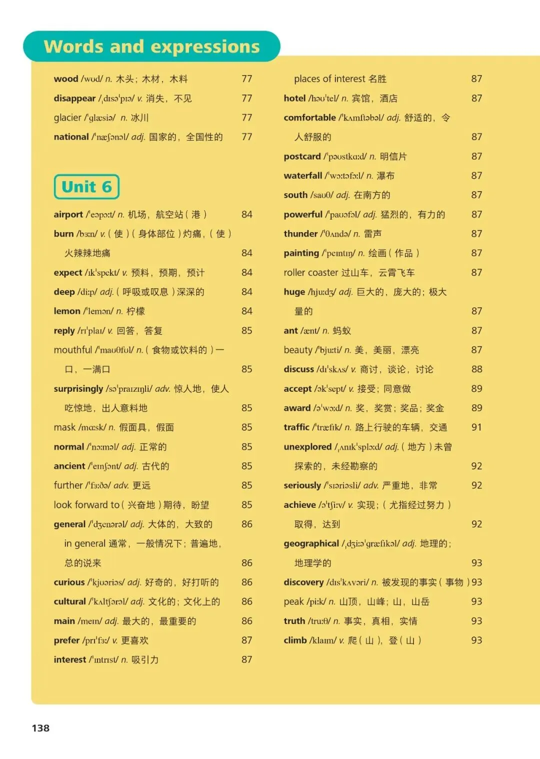 1、spring /sprɪŋ/ n. 春天2、summer /ˈsʌmə/ n. 夏天3、autumn /ˈɔːtəm/ n. 秋天4、winter /ˈwɪntə/ n. 冬天5、weather /ˈweðə/ n. 天气6、warm /wɔːm/ adj. 温暖的7、cold /kəʊld/ adj. 寒冷的8、hot /hɒt/ adj. 炎热的9、cool /kuːl/ adj. 凉爽的10、visit /ˈvɪzɪt/ v. 参观11、travel /ˈtrævəl/ v. 旅行12、holiday /ˈhɒlədeɪ/ n. 假期13、train /treɪn/ n. 火车14、plane /pleɪn/ n. 飞机15、walk /wɔːk/ v. 走路16、busy /ˈbɪzi/ adj. 忙碌的17、free /friː/ adj. 空闲的18、lesson /ˈlesən/ n. 课19、homework /ˈhəʊmwɜːk/ n. 作业20、library /ˈlaɪbrəri/ n. 图书馆21、shop /ʃɒp/ n./v. 商店;购物22、restaurant /ˈrestrɒnt/ n. 餐馆23、hospital /ˈhɒspɪtl/ n. 医院24、park /pɑːk/ n. 公园25、river /ˈrɪvə/ n. 河流26、mountain /ˈmaʊntən/ n. 山27、because /bɪˈkɒz/ conj. 因为28、usually /ˈjuːʒuəli/ adv. 通常29、sometimes /ˈsʌmtaɪmz/ adv. 有时30、always /ˈɔːlweɪz/ adv. 总是