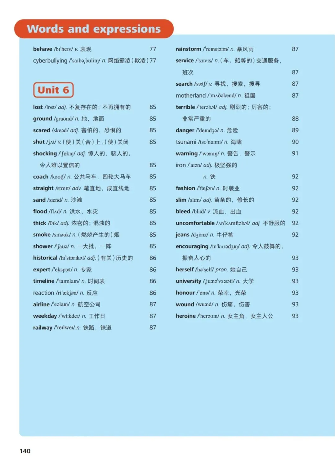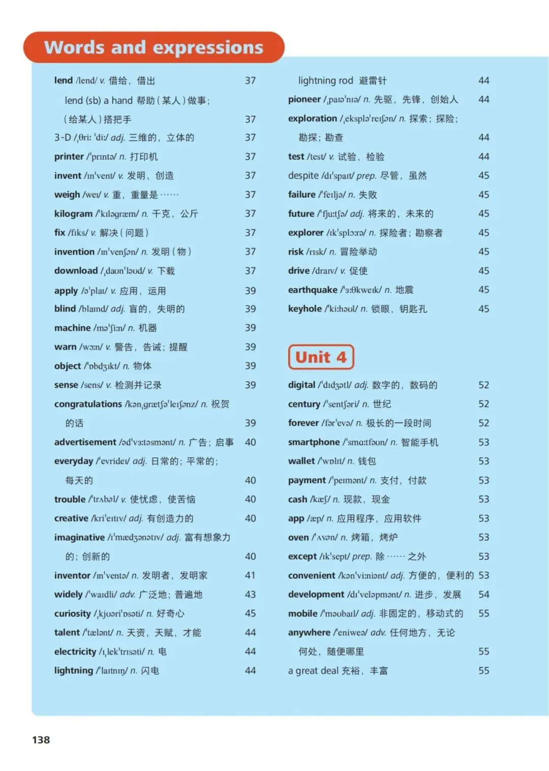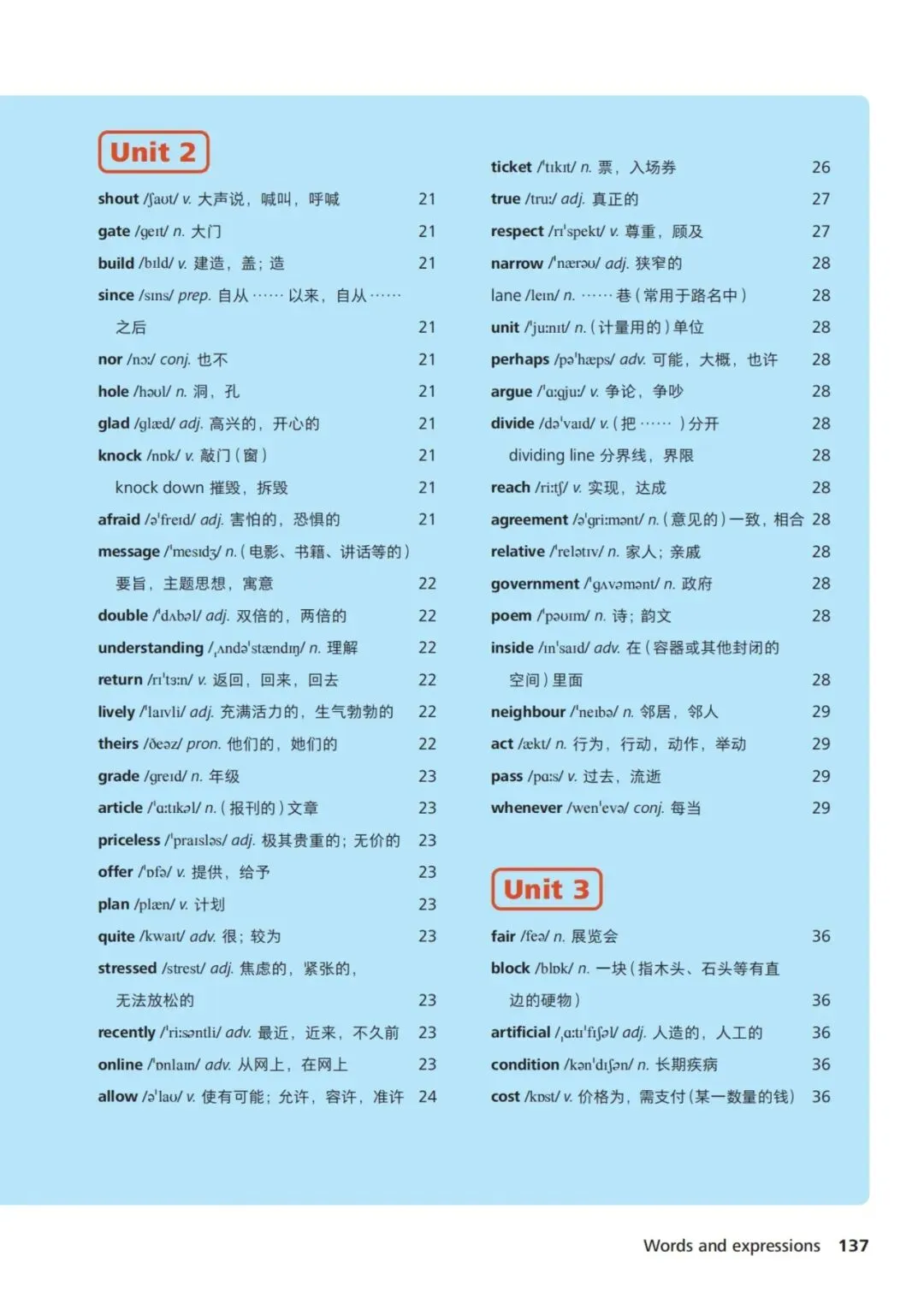 1、health /helθ/ n. 健康2、exercise /ˈeksəsaɪz/ n./v. 锻炼3、habit /ˈhæbɪt/ n. 习惯4、important /ɪmˈpɔːtənt/ adj. 重要的5、advice /ədˈvaɪs/ n. 建议6、problem /ˈprɒbləm/ n. 问题7、improve /ɪmˈpruːv/ v. 提高8、practice /ˈpræktɪs/ v./n. 练习9、danger /ˈdeɪndʒə/ n. 危险10、safe /seɪf/ adj. 安全的11、protect /prəˈtekt/ v. 保护12、environment /ɪnˈvaɪrənmənt/ n. 环境13、pollution /pəˈluːʃən/ n. 污染14、noise /nɔɪz/ n. 噪音15、traffic /ˈtræfɪk/ n. 交通16、accident /ˈæksɪdənt/ n. 事故17、information /ˌɪnfəˈmeɪʃən/ n. 信息18、internet /ˈɪntənet/ n. 互联网19、future /ˈfjuːtʃə/ n. 未来20、robot /ˈrəʊbɒt/ n. 机器人21、planet /ˈplænɪt/ n. 行星22、space /speɪs/ n. 太空23、science /ˈsaɪəns/ n. 科学24、culture /ˈkʌltʃə/ n. 文化25、tradition /trəˈdɪʃən/ n. 传统26、festival /ˈfestɪvl/ n. 节日27、invite /ɪnˈvaɪt/ v. 邀请28、celebrate /ˈselɪbreɪt/ v. 庆祝29、journey /ˈdʒɜːni/ n. 旅程30、experience /ɪkˈspɪəriəns/ n./v. 经历