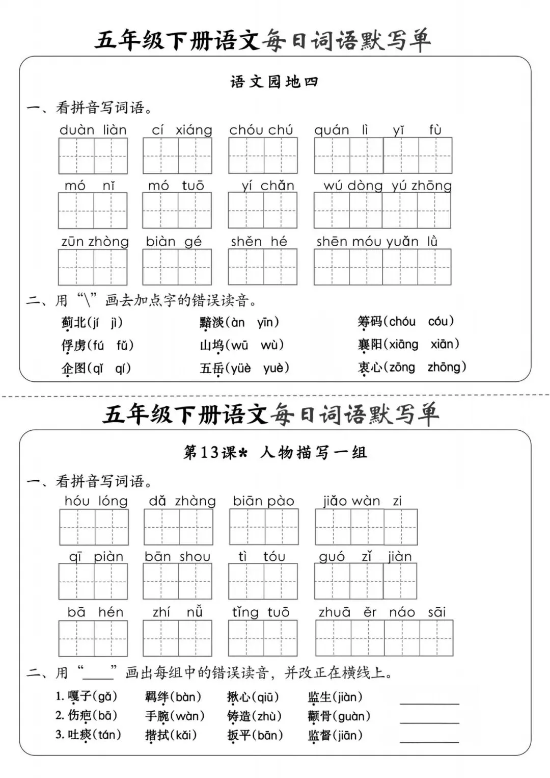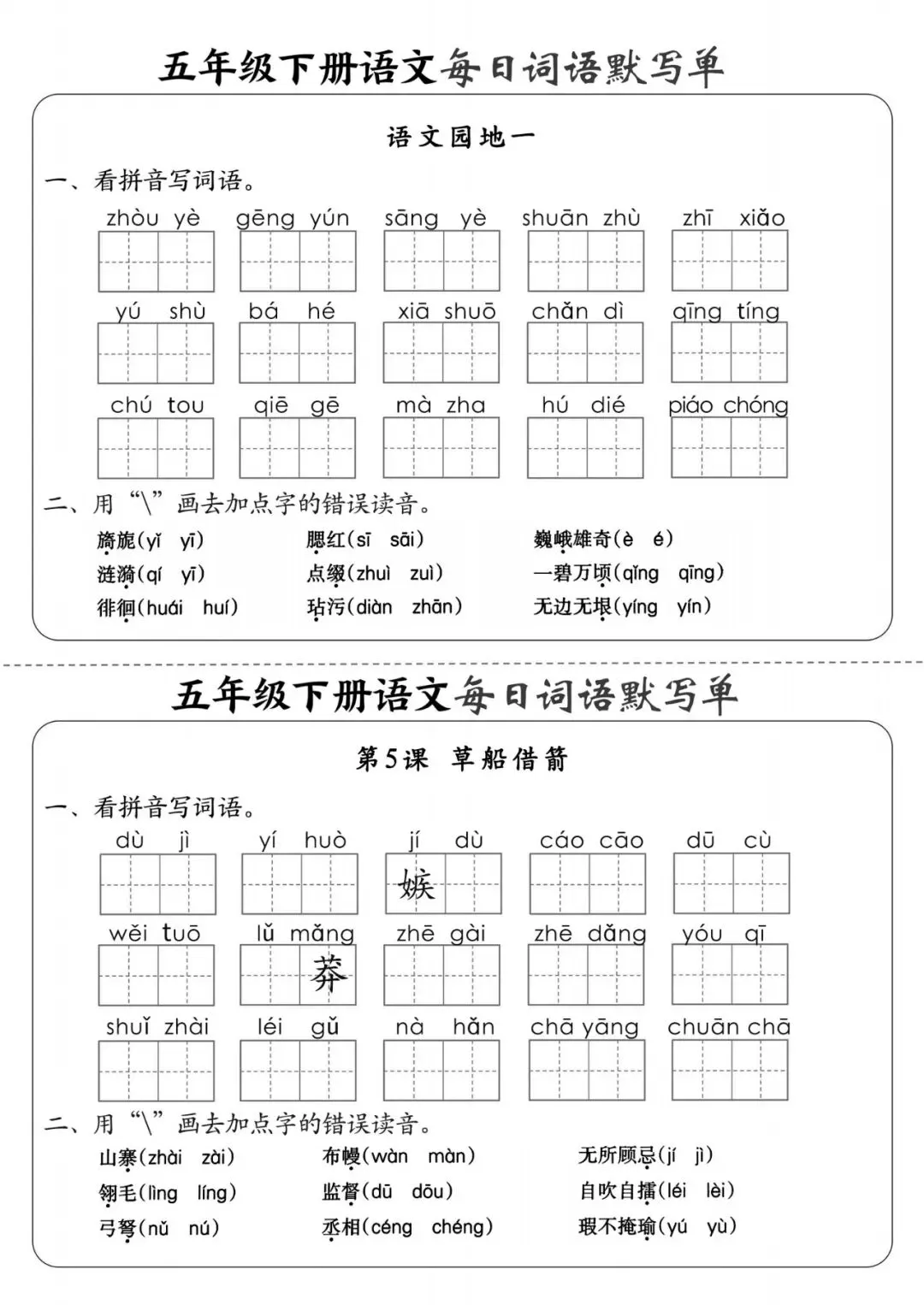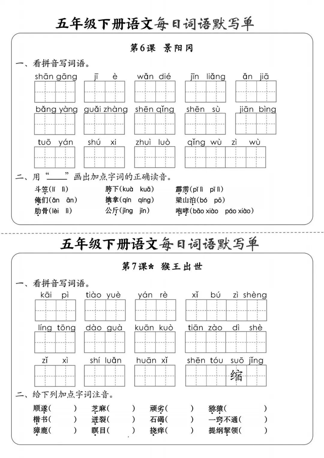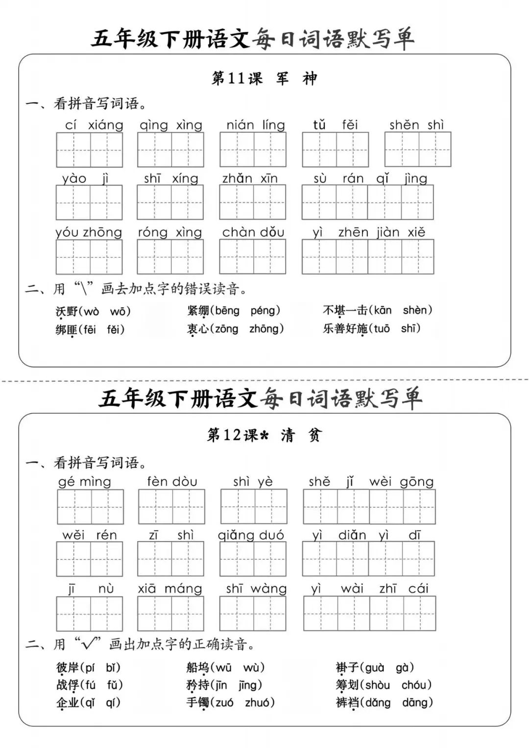 五年级(下)语文《每日词语默写单》,可下载打印 文末有高清电子版领取方式 由于篇幅有限,高清完整版请下载电子版哦 领取完整电子版方式: ①:发财的小手点一点右下角“👍”和“❤️” ②:关注公众号后,在对话框中回复:003 (点击名片可直接关注)↑↑↑