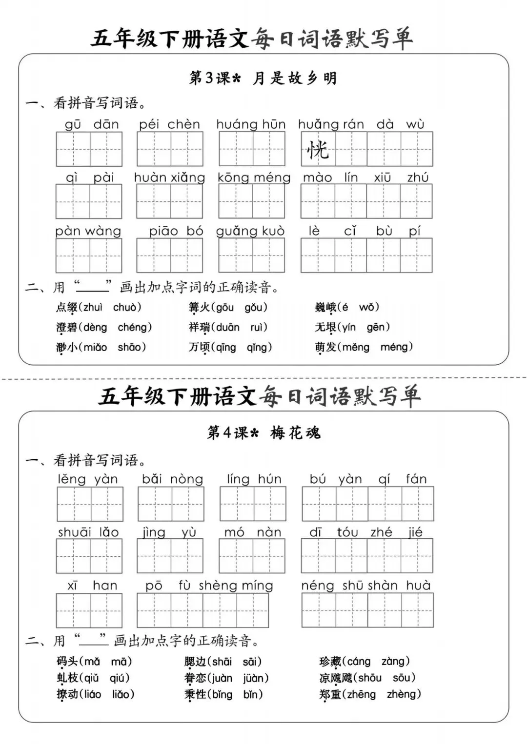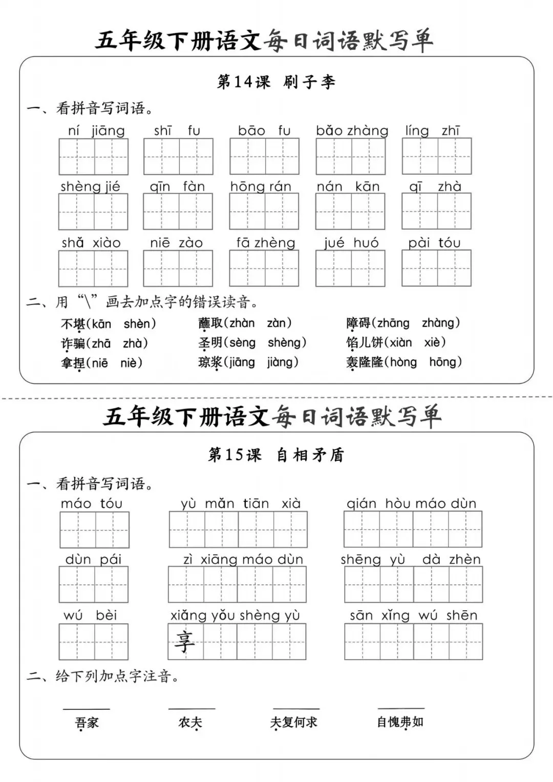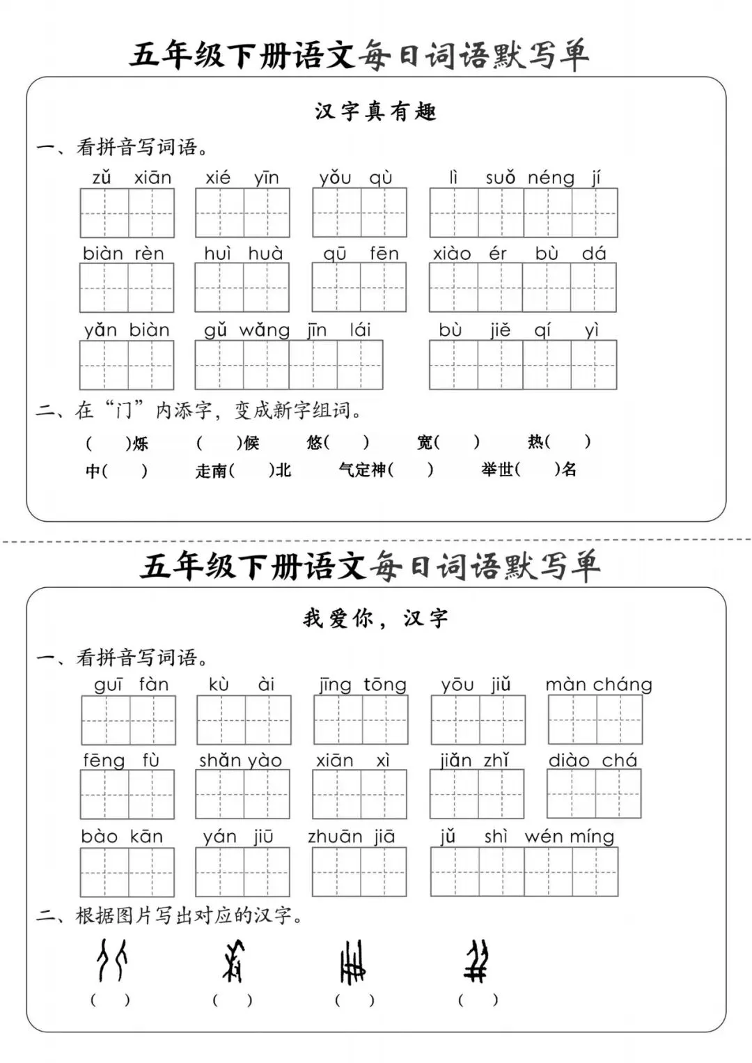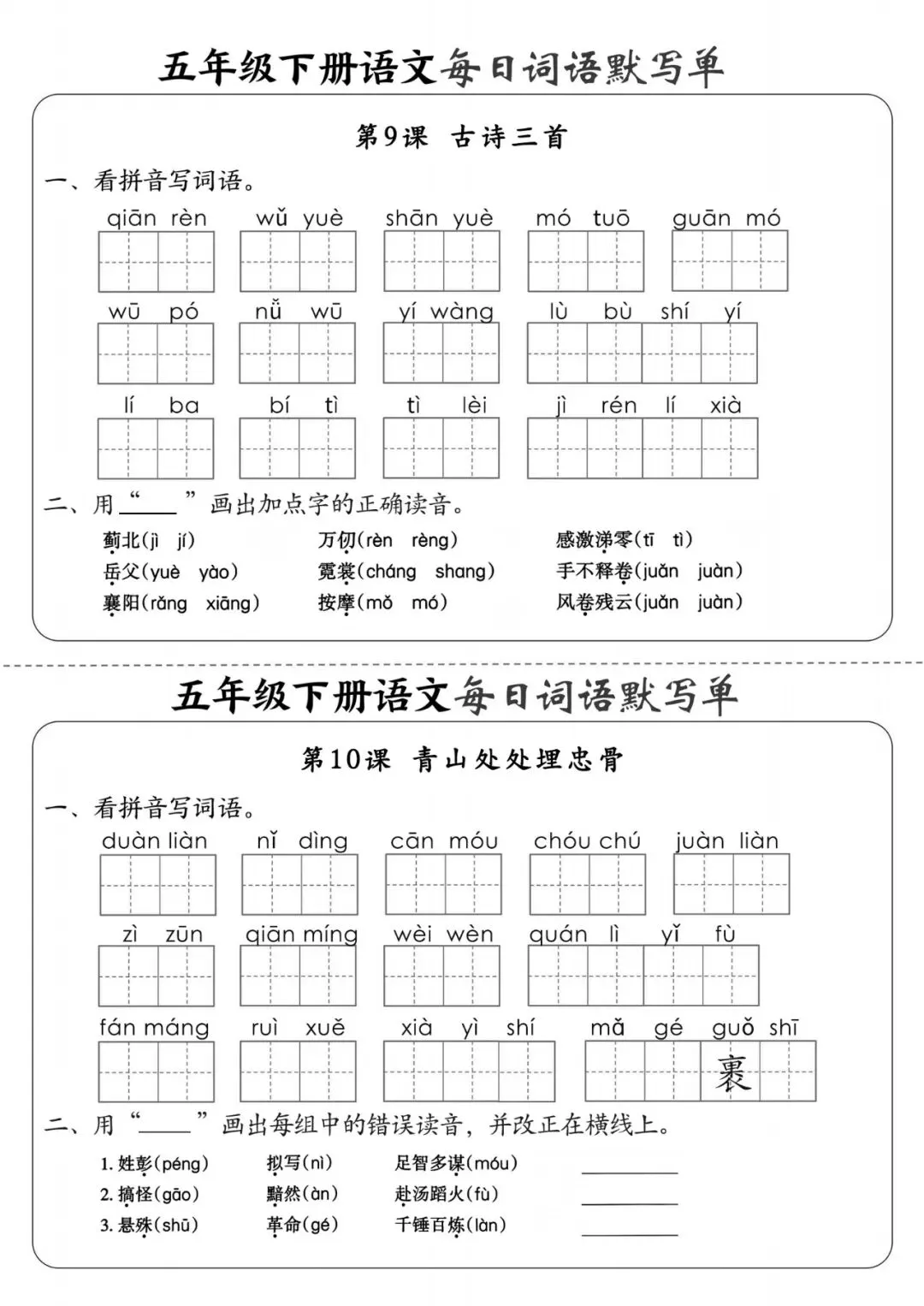 五年级(下)语文《每日词语默写单》,可下载打印 文末有高清电子版领取方式 由于篇幅有限,高清完整版请下载电子版哦 领取完整电子版方式: ①:发财的小手点一点右下角“👍”和“❤️” ②:关注公众号后,在对话框中回复:003 (点击名片可直接关注)↑↑↑