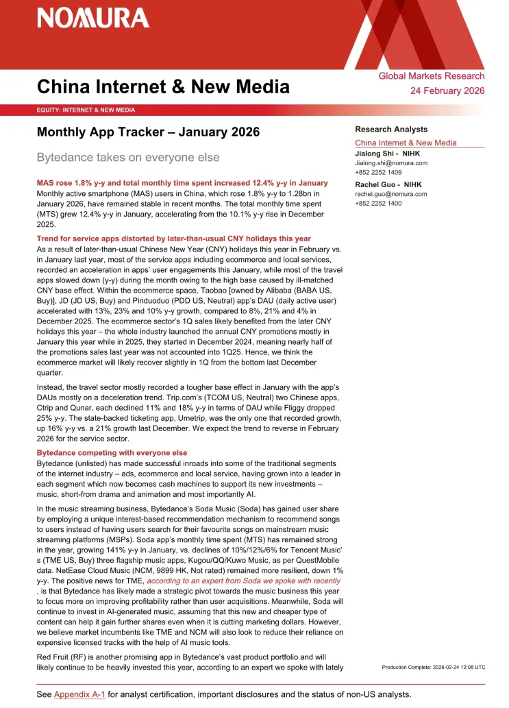 大盘数据:2026年1月,中国月活跃智能手机用户(MAS)同比增长1.8%,达到12.8亿,大盘保持稳定 。用户的总月度使用时长(MTS)同比增长12.4%,增速较上个月的10.1%有所加快 。