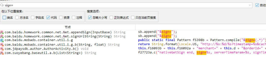 主要是sign参数,定位依然采用搜索大法;这里尝试搜索sign”、”sign、”sign”、=sign、sign=,最终 sign= 有比较明显的字眼;
