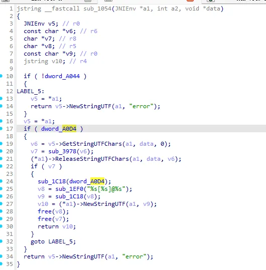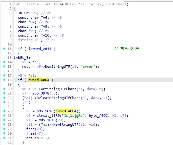 这时候请回想分析getsign函数的时候,dword_A0D4也有判断,并且md5还需要加密使用到它;