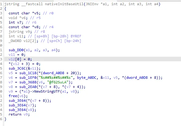留个心眼,nativeInitBaseUtil、nativeSetToken这种函数极有可能是需要我们执行的,也就是初始化函数,先不着急看这些,直接call目标函数;