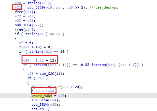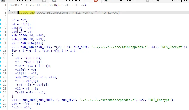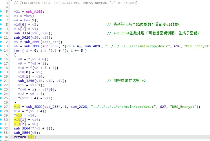 复制代码 隐藏代码structDesResult { DWORD size; // 第一个字段,v14 DWORD size_copy; // 第二个字段,v14(与第一个相同) DWORD* data; // 第三个字段,v6,指向加密后的数据};
