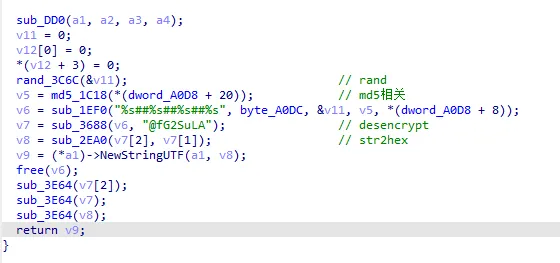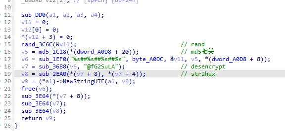 生成的结果就是:8&%d*,和hook的结果是对得上的;这里的v3跟进去实际上也不是一个多复杂的算法,感兴趣可以去还原一下,实际上没有进行随机化,每个设备都可能是这个值,就说到这里; -