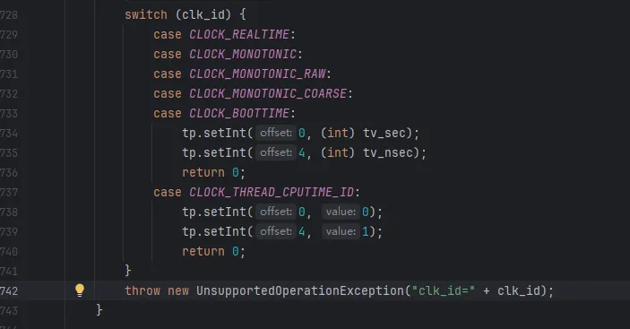 这是一个系统调用相关的错误,clock_gettime这个系统调用,不熟悉的读者可以留言我后面可以单独写一篇文章;我们可以从第一行报错点进去;