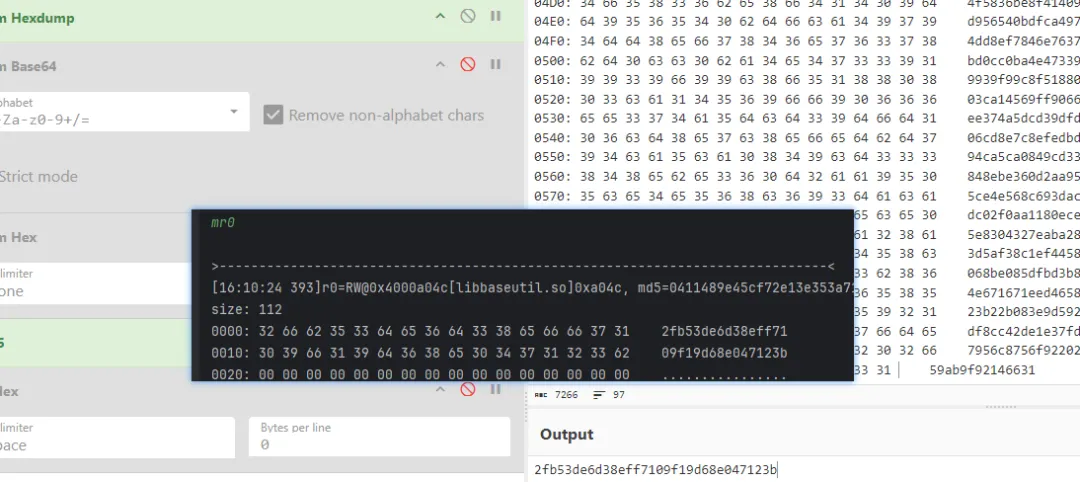 复制代码 隐藏代码functionhook_java() {Java.perform(function () {letNativeHelper = Java.use("com.zuoyebang.baseutil.NativeHelper");NativeHelper["nativeInitBaseUtil"].implementation = function (context, str) {console.log(`NativeHelper.nativeInitBaseUtil is called: context=${context}, str=${str}`);let result = this["nativeInitBaseUtil"](context, str);console.log(`NativeHelper.nativeInitBaseUtil result=${result}`);return result; };NativeHelper["nativeSetToken"].implementation = function (context, str, str2, str3) {console.log(`NativeHelper.nativeSetToken is called: context=${context}, str=${str}, str2=${str2}, str3=${str3}`);let result = this["nativeSetToken"](context, str, str2, str3);console.log(`NativeHelper.nativeSetToken result=${result}`);return result; };NativeHelper["nativeGetSign"].implementation = function (str) {console.log(`NativeHelper.nativeGetSign is called: str=${str}`);let result = this["nativeGetSign"](str);console.log(`NativeHelper.nativeGetSign result=${result}`);return result; }; })}functionhook_dlopen() {var android_dlopen_ext = Module.findExportByName(null, "android_dlopen_ext");Interceptor.attach(android_dlopen_ext, {onEnter: function (args) {var path_ptr = args[0];var path = ptr(path_ptr).readCString();if (path && path.indexOf("libbaseutil.so") !== -1) {console.log("[android_dlopen_ext:]", path);this.flag = true; } },onLeave: function (retval) {if (this.flag) {constmodule = Process.findModuleByName("libbaseutil.so");let jni_onload = module.findExportByName("JNI_OnLoad")console.log("JNI_OnLoad--->>>" + jni_onload);Interceptor.attach(jni_onload, {onEnter: function (args) {console.log("JNI_OnLoad onEnter") },onLeave: function (retval) {console.log("JNI_OnLoad onLeave")hook_java() } }) } } });}setImmediate(hook_dlopen)