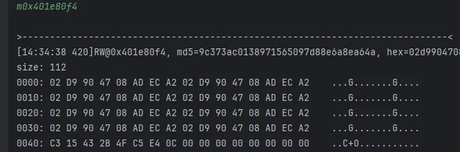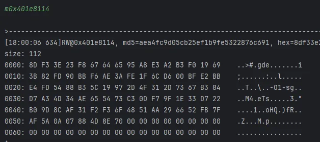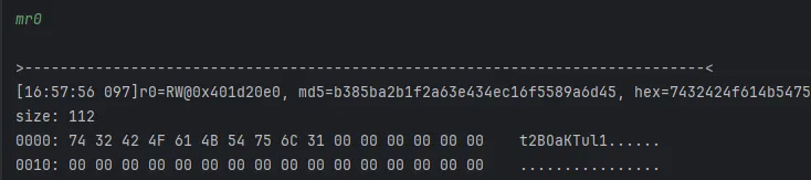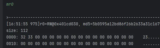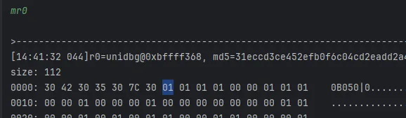 复制代码 隐藏代码emulator.attach().addBreakPoint(module.base + 0x1EF0, newBreakPointCallback() {@OverridepublicbooleanonHit(Emulator<?> emulator, long address) {RegisterContextcontext= emulator.getContext();UnidbgPointerpointer1= context.getPointerArg(0); Inspector.inspect(pointer1.getByteArray(0, 0xe), "参数0");UnidbgPointerpointer2= context.getPointerArg(1); Inspector.inspect(pointer2.getByteArray(0, 0x5), "参数1");UnidbgPointerpointer3= context.getPointerArg(2); Inspector.inspect(pointer3.getByteArray(0, 0xa), "参数2 随机数");UnidbgPointerpointer4= context.getPointerArg(3); Inspector.inspect(pointer4.getByteArray(0, 0x20), "参数3 md5签名");// 3. 获取栈指针UnidbgPointersp= context.getStackPointer();intarg5= sp.getInt(0); // 栈顶第一个32位值是第5个参数UnidbgPointerarg555= UnidbgPointer.pointer(emulator, arg5); Inspector.inspect(arg555.getByteArray(0, 0x22), "参数4");// int arg6 = sp.getInt(4); // 下一个32位值是第6个参数// int arg7 = sp.getInt(8); // 再下一个32位值是第7个参数returntrue; }});