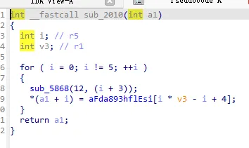 传进来的参数就是byte_A0DC,这个函数就是真正赋值的地方;从aFda893hflEsi这个内容里取数据,一共循环5次,我们可以打印一下2010函数的返回值 ;