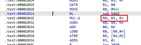 可以发现,MUL.W R0, R5, R1是乘法指令,也就是说R1就是v3的值,我们去hook打印一下;