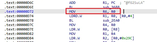 这是在函数结束时读的r0,看不出什么东西,不太像结果,但是伪代码很清晰的说: v7 = sub_3688(v6, “@fG2SuLA”),返回值就是r0,所以只能看汇编了;
