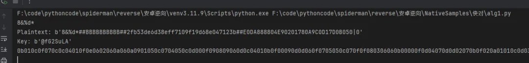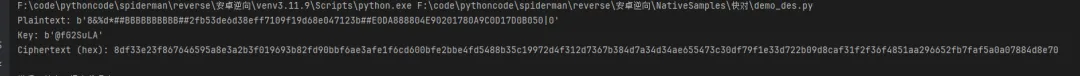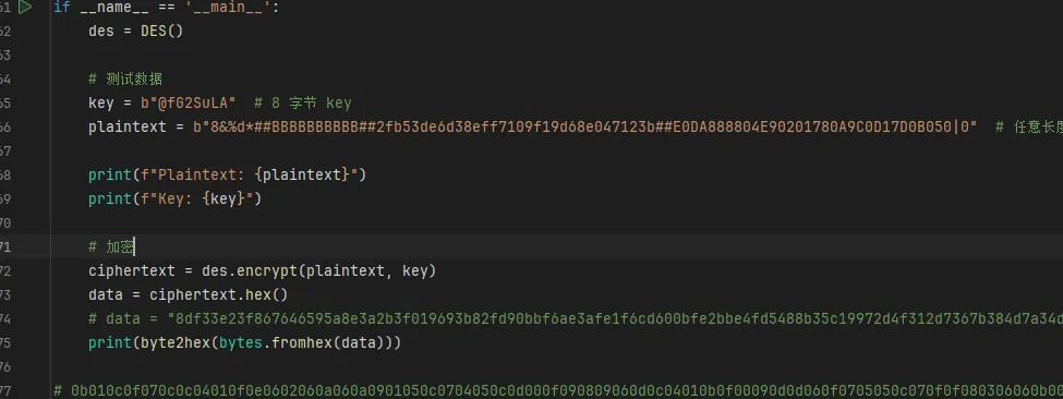 复制代码 隐藏代码key2 = b'95b8L#G4'ciphertext2 = hex2byte("0c000a01090d0e04020c0a0e06010b0d050a080e0c0f03050c0a0602060e0c0207090c0a0d090f060a060e08030a0003")decrypted2 = des.decrypt(ciphertext2, key2)print(f"Decrypted2: {decrypted2}")