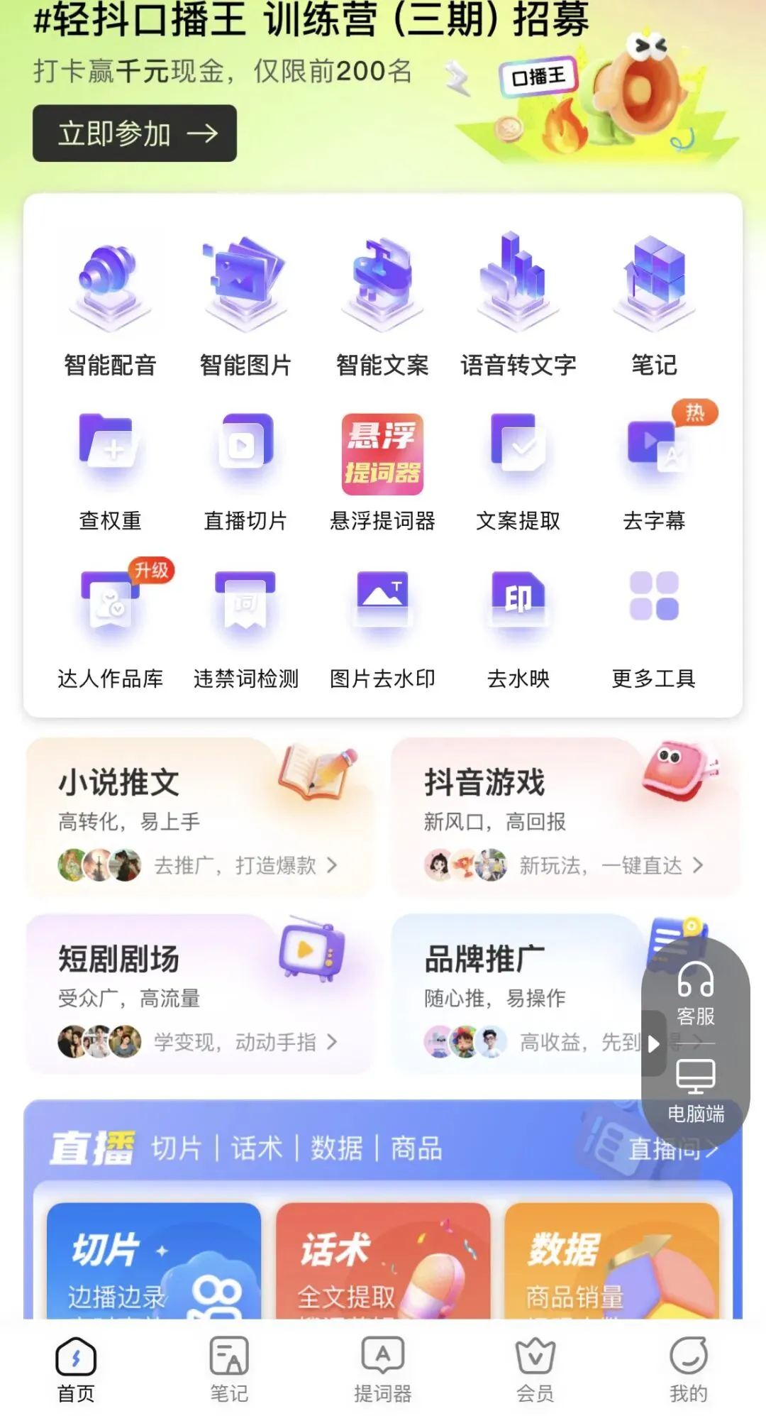 为适配不同用户的使用习惯,这款APP打造了多终端协同的产品矩阵,覆盖手机APP、小程序、网页版三大端口,数据跨端自动同步,无需手动转移文件。手机端便于随时随地处理素材、拍摄提词、查看数据;小程序无需下载安装,微信内即可快速使用,适合临时应急操作;网页版界面更宽敞,功能展示更全面,适合电脑前批量剪辑、深度数据分析、直播切片等专业操作。
