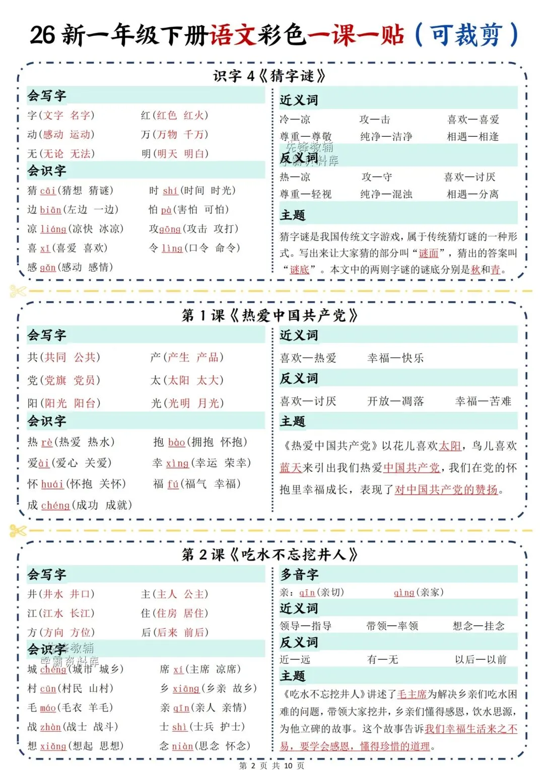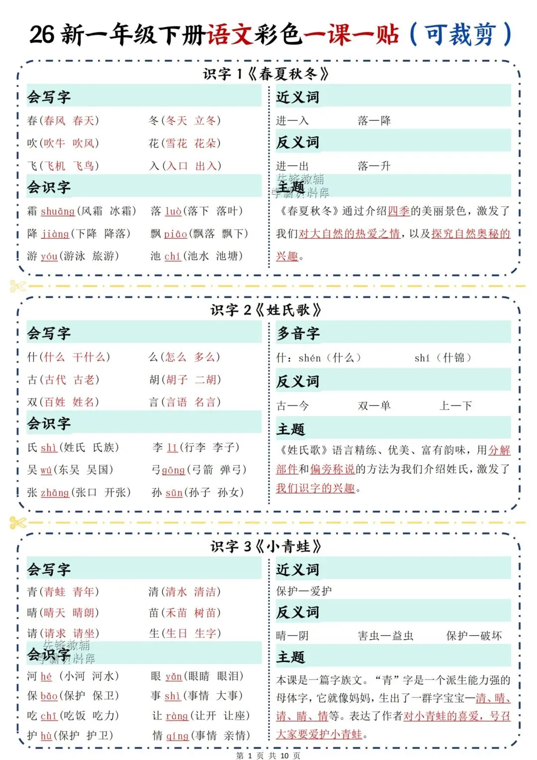 2026春最新版:《一年级语文下册课课贴》电子版可打印