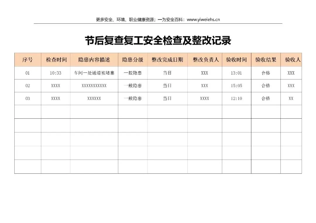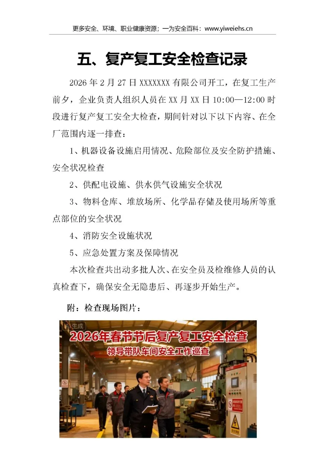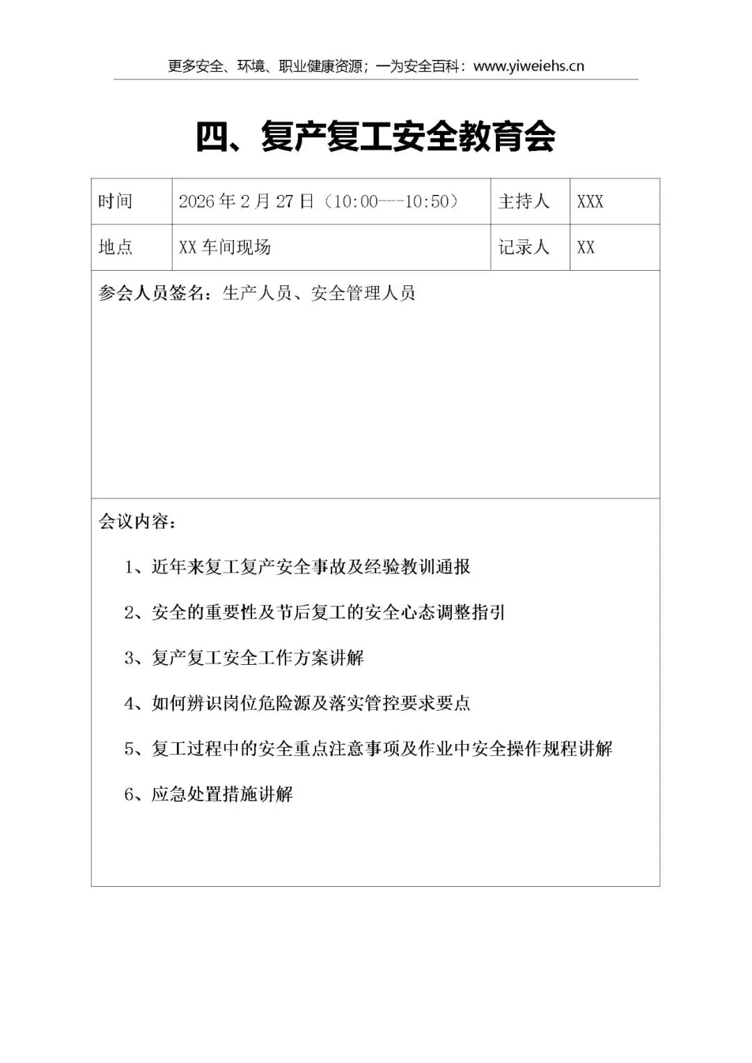 总体特点:文档结构清晰,内容详实,提供了具体的会议记录、检查表格、应急预案模板,具有很强的操作性和指导性,旨在通过系统化的“六个一”措施,全面排查隐患,强化教育培训,完善应急准备,确保节后复工复产安全。