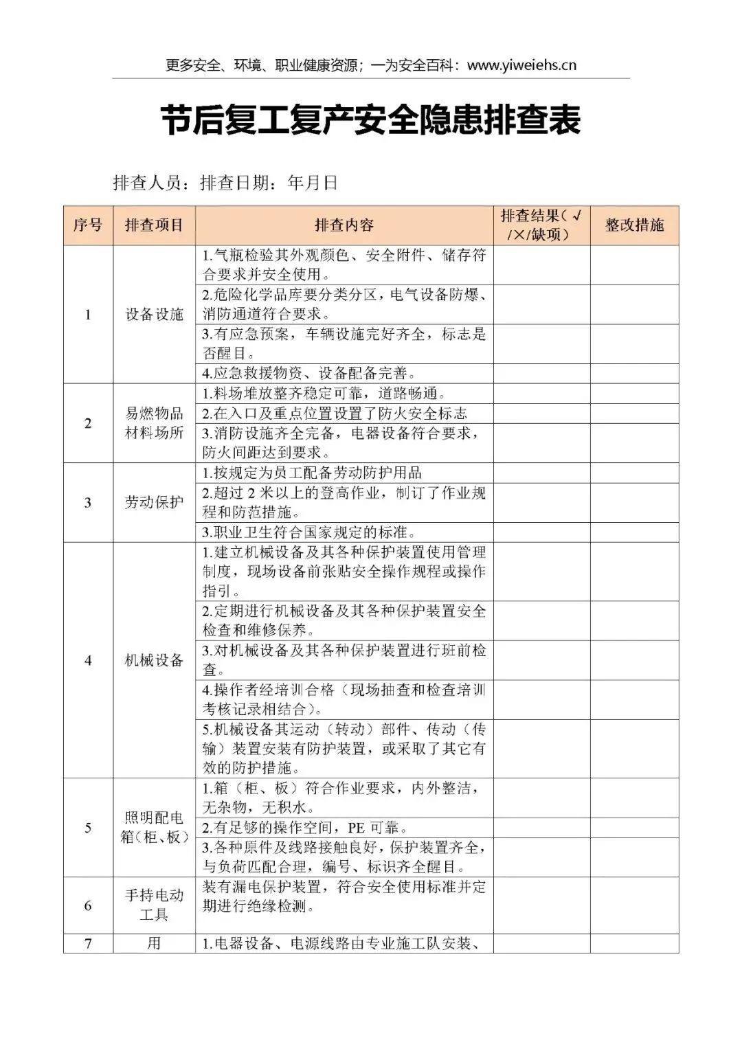 文档提供了详细的《节后复工复产安全隐患排查表》,包含设备设施、易燃物品、劳动保护、机械设备、用电安全、厂区环境、车间环境、仓库、危险品、职业危害等12大类检查项目及具体内容。
