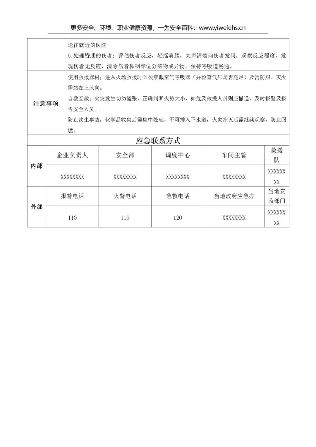 列出了内部(企业负责人、安全部等)和外部(110、119、120、政府应急办等)应急联系方式。