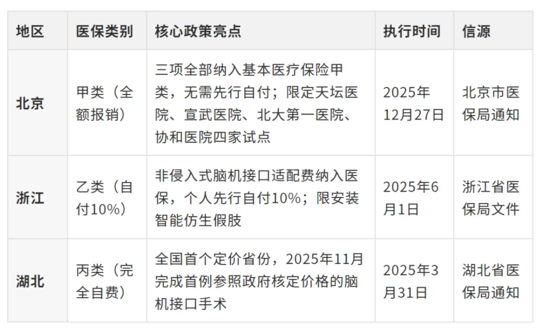 政策环境是产业发展的土壤。自2025年3月国家医保局首次将脑机接口纳入神经系统类医疗服务价格项目立项指南以来,全国已有超过二十个省份陆续出台相关收费标准,北京、浙江、湖北三地更进一步将部分项目纳入医保支付范围。