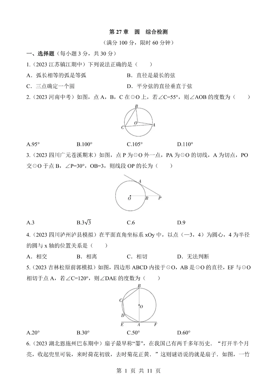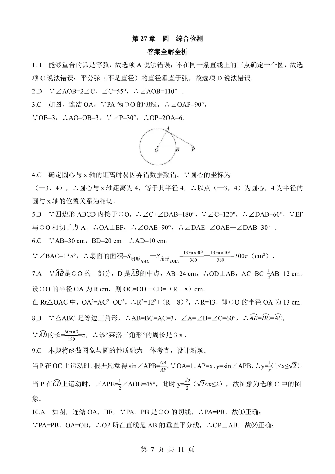 【九年级下册数学华东师大版】初三下册数学第27章 圆 综合检测带答案,完整可打印