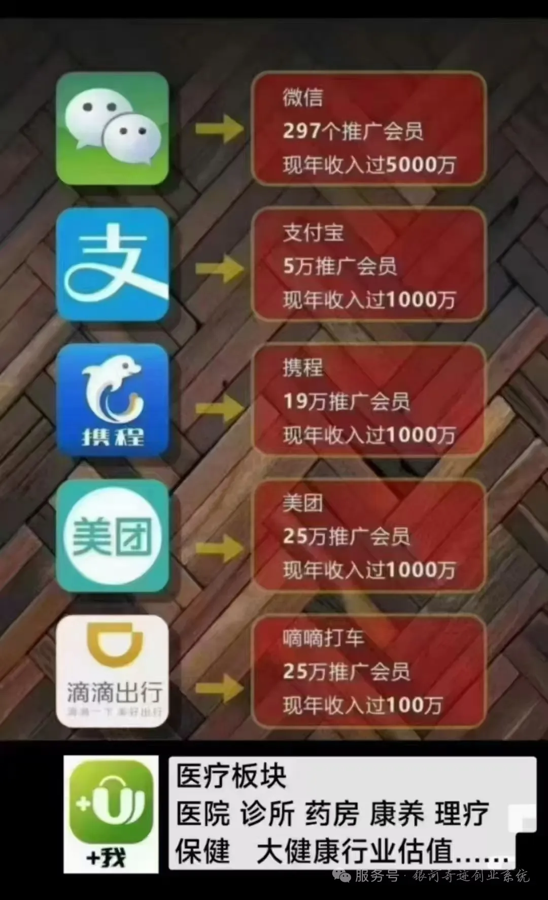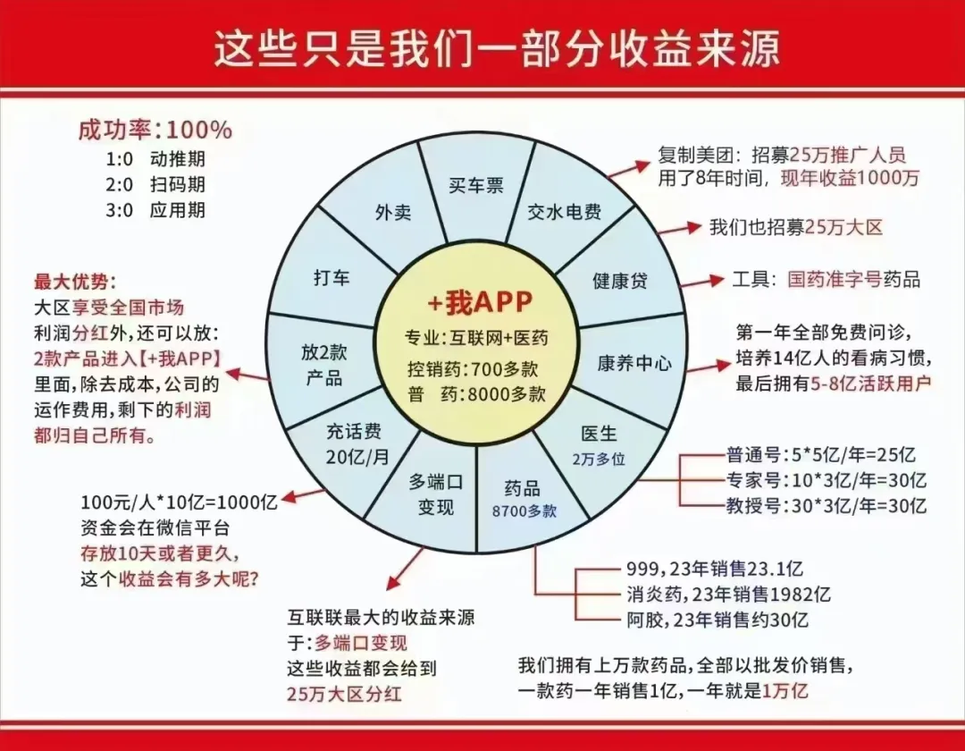 我们平台就推广这两三年,推广上线后就不需要推广了;前期有推广奖励和团队管理奖励;平台上线后获得平台分润,就像美团一样,上面所有的商家和流过的每一份收益都和你有关,那些推广美团、推广滴滴、推广饿了吗……那些人都身价千万了;今天我们的+我APP事业只会让你获得更多的财富;