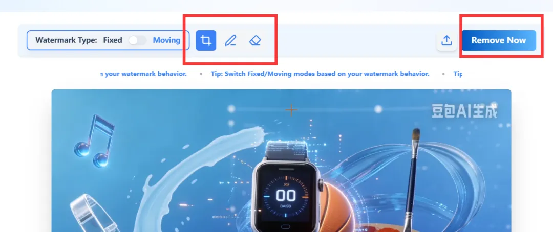 第三步,精准标记水印区域。操作界面提供了两种标记工具,按需选择即可:如果是规则的矩形水印,直接点击上方的矩形工具,框选水印所在区域;如果是不规则的动态水印,先调整画笔大小,再用画笔在水印处仔细涂抹,确保水印区域被完整覆盖。标记完成后,点击 “Remove Now” 按钮,工具便会自动启动去水印处理。