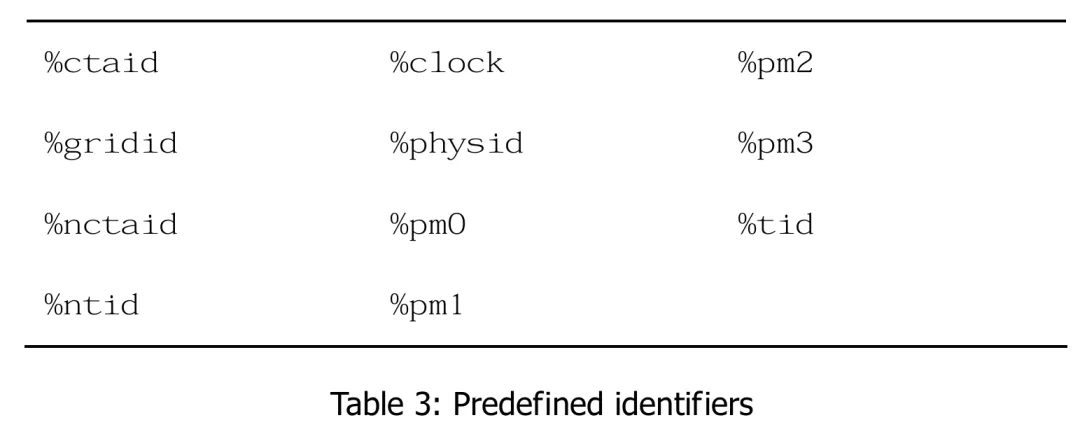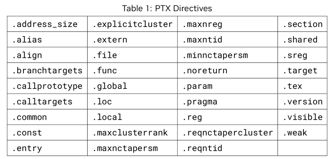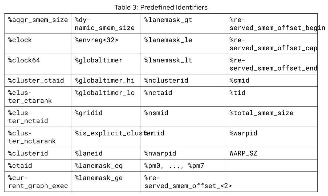 最近版本的 PTX 文档相对于我们之前聊过的初版变动并不多,跟着 84 页的 PTX 1.0 文档第4章那5页纸能学会写 PTX 代码么?不能。。。快二十年过去,“C: AReference Manual by Harbison and Steele provides a good description of the C preprocessor.”,这句话还在,这段老演员代码片段也没怎么变。在一些适当的地方,比如讲自己起名的格式的时候,倒是像 golang 文档一样用起了正则表达式,这样更清晰精简些:“PTX does not specify a maximum length for identifiers and suggests that all implementations support a minimum length of at least 1024 characters.”这句比较奇怪,不造在 suggests 哪里的 implementations 支持长名字。predefined identifiers 相对于 1.0 的时候多了不少(这个 pdf 排版和 WARP_SZ 都挺出戏的)剩下几页讲常量和常量计算的内容挺多,包括运算符优先级等内容,但可以用的时候再看,估计也全是些编译期在 CPU 上算的东西,类似神经网络计算图的常量折叠(如果不做常量计算,只 hard code magic number,可能就不用管这些了,反正 PTX 代码的可读性也没有特别好其实。。。),需要注意的还是常量计算的时候 int 和 float 都是默认 8byte 宽的类型,求准不求快。而下面这些,我的朋友,可能才是真正要唠好久的东西:我们争取先把那些偏属性的,相对独立的,静态的东西搞清楚;不然就很容易被那些偏行为的,组合性的,动态的东西给绕的很迷糊。。
