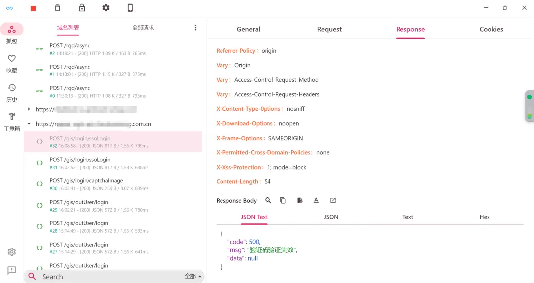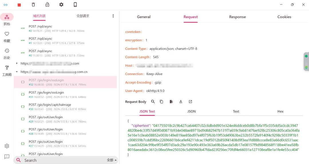 可以看到,虽然成功拦截到正常请求了,但是请求包是加密的,返回包却是明文的