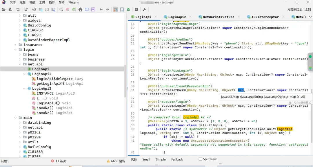 我们使用jadx打开项目后,很快就能定位到请求的接口,可以看到首先LoginApi定义了登录相关的 API 方法,使用 Retrofit 注解标记 HTTP 方法和路径