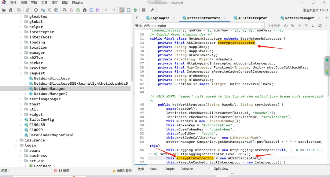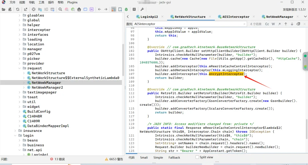 跟进 NetWorkStructure类,发现这里面配置了网络请求的核心组件,包括拦截器、请求头、缓存等;并且里面创建了一个名为AESInterceptor的实例?但是这个实例里面实际上包装的是SM2加密方法,这就很迷,又被开发玩弄了这是?