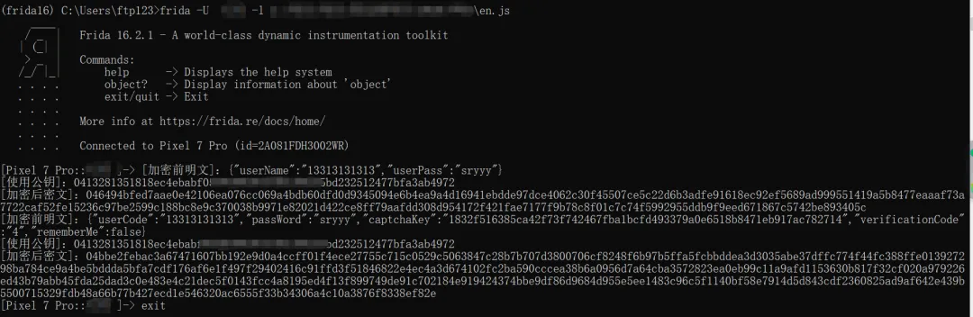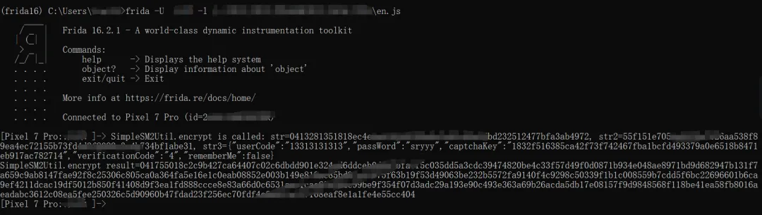 Java.perform(function() {var SimpleSM2Util = Java.use("com.xxx.intercepter.SimpleSM2Util");SimpleSM2Util.encrypt.implementation = function(pubKey, param2, plaintext) {console.log("[加密前明文]:" + plaintext);console.log("[使用公钥]:" + pubKey);var result = this.encrypt(pubKey, param2, plaintext);console.log("[加密后密文]:" + result);return result;};});