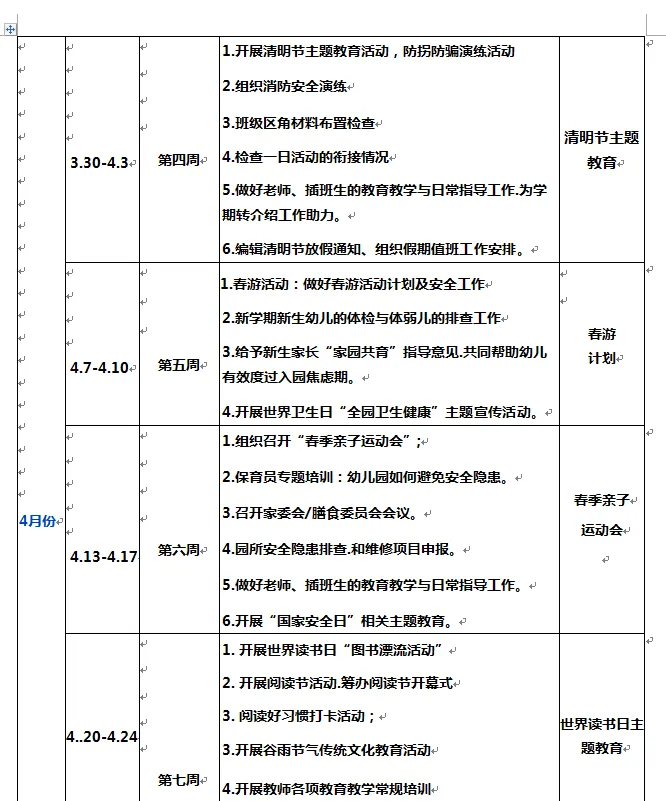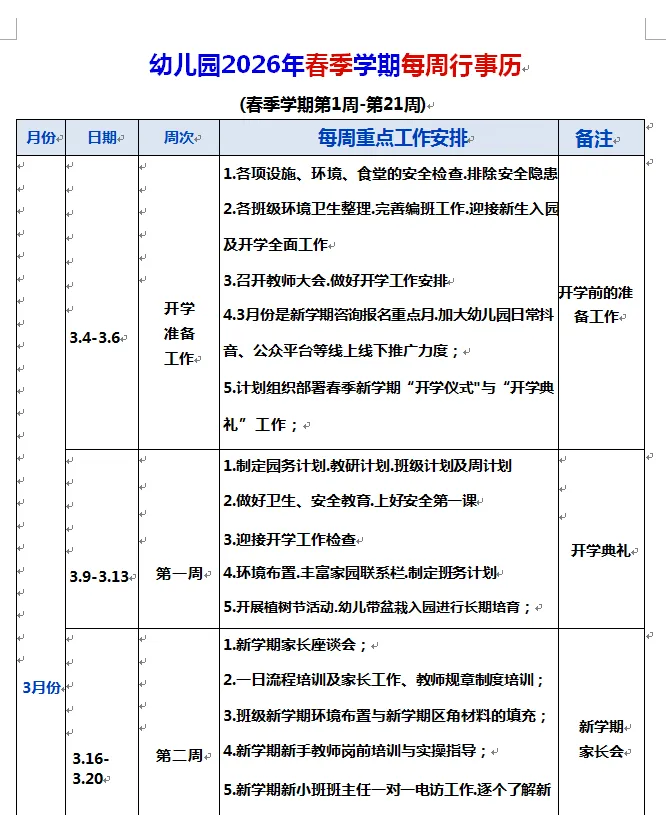 幼儿园2026春季学期每周行事历,电子版免费领取