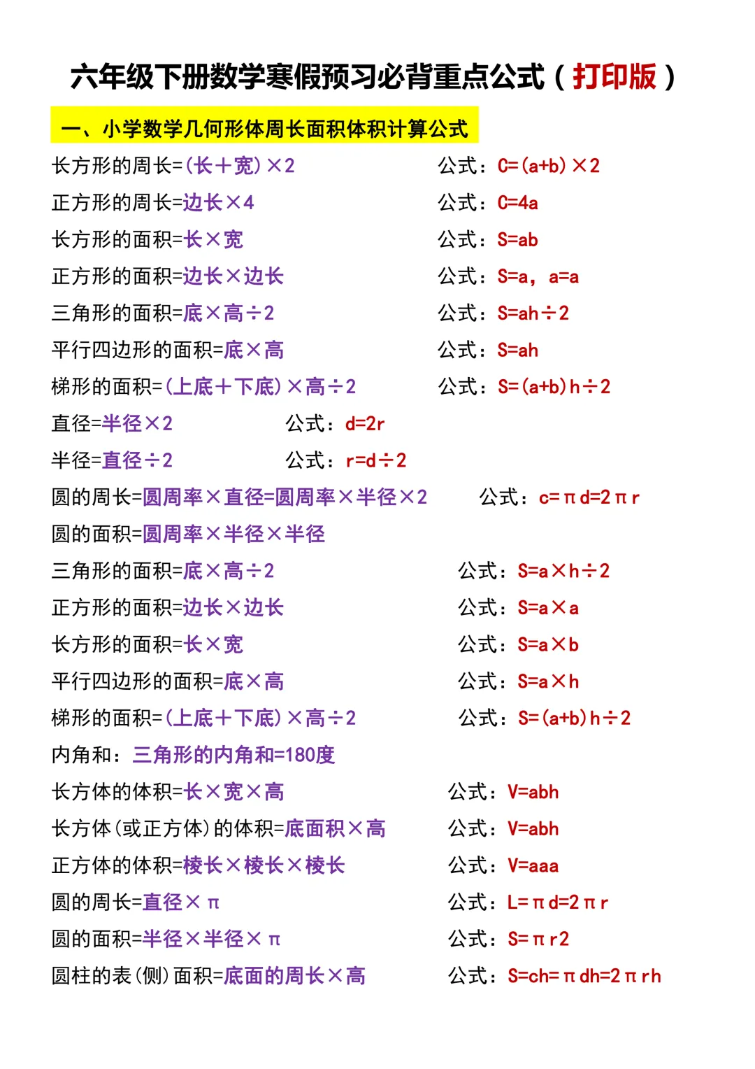 今天为大家分享:寒假是弯道超车的黄金期,尤其对于即将进入六年级下册的学生来说,提前梳理数学核心公式,不仅能为新学期减负,更能筑牢知识地基。数学学习离不开公式的灵活运用,无论是几何图形的计算,还是分数运算、数量关系求解,掌握关键公式就等于拿到了打开解题大门的钥匙。