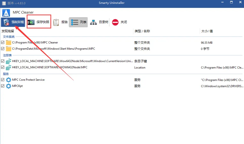 接着点击软件左上角的强制删除选项就能完成程序卸载,操作界面上方还能保存当前快照,按这几步操作就能顺利删掉目标程序