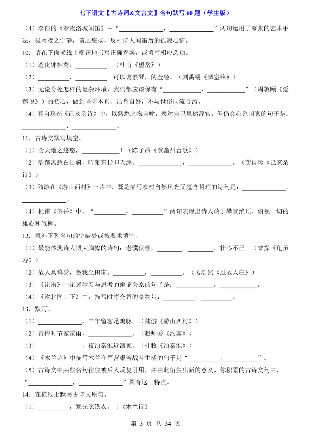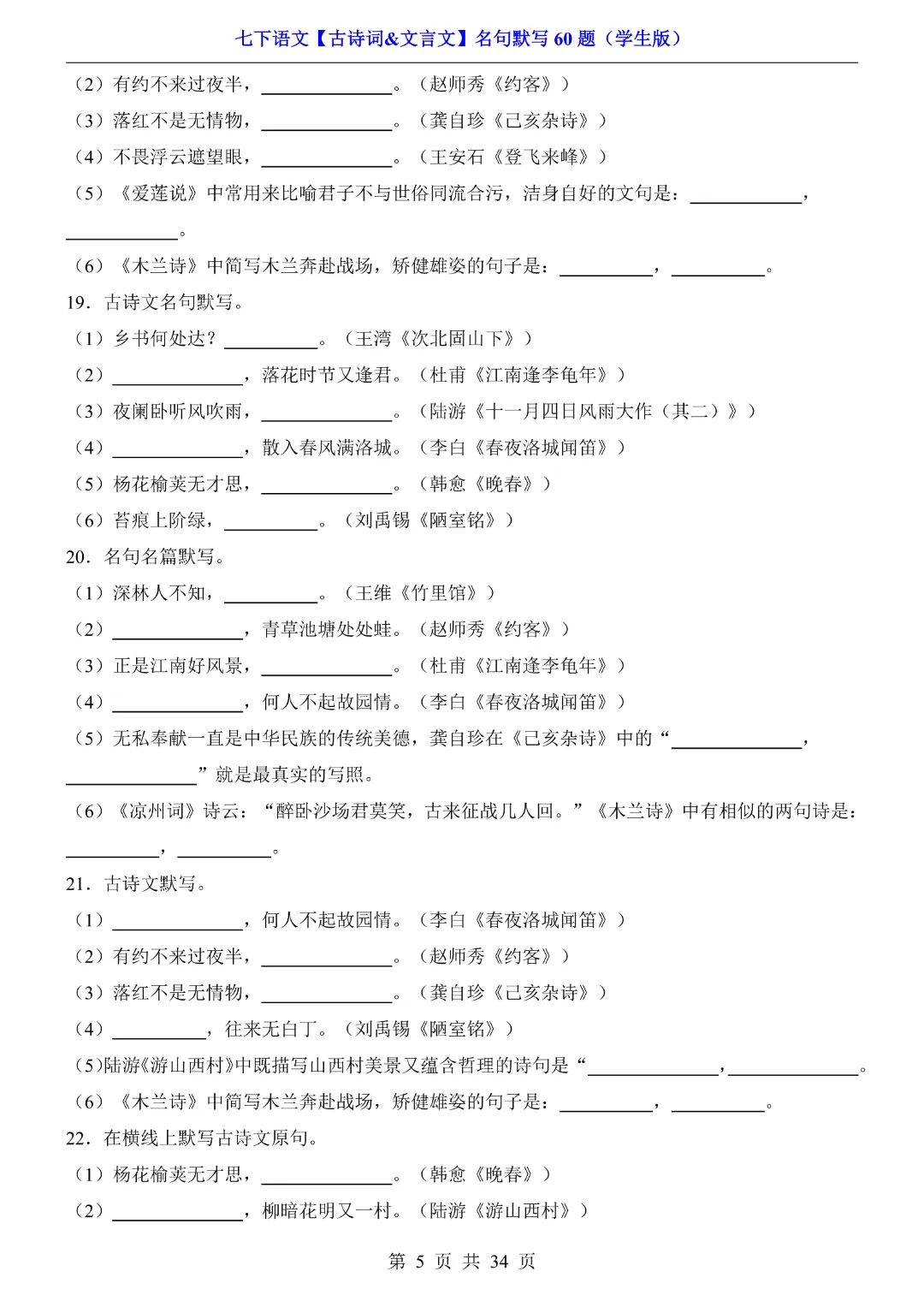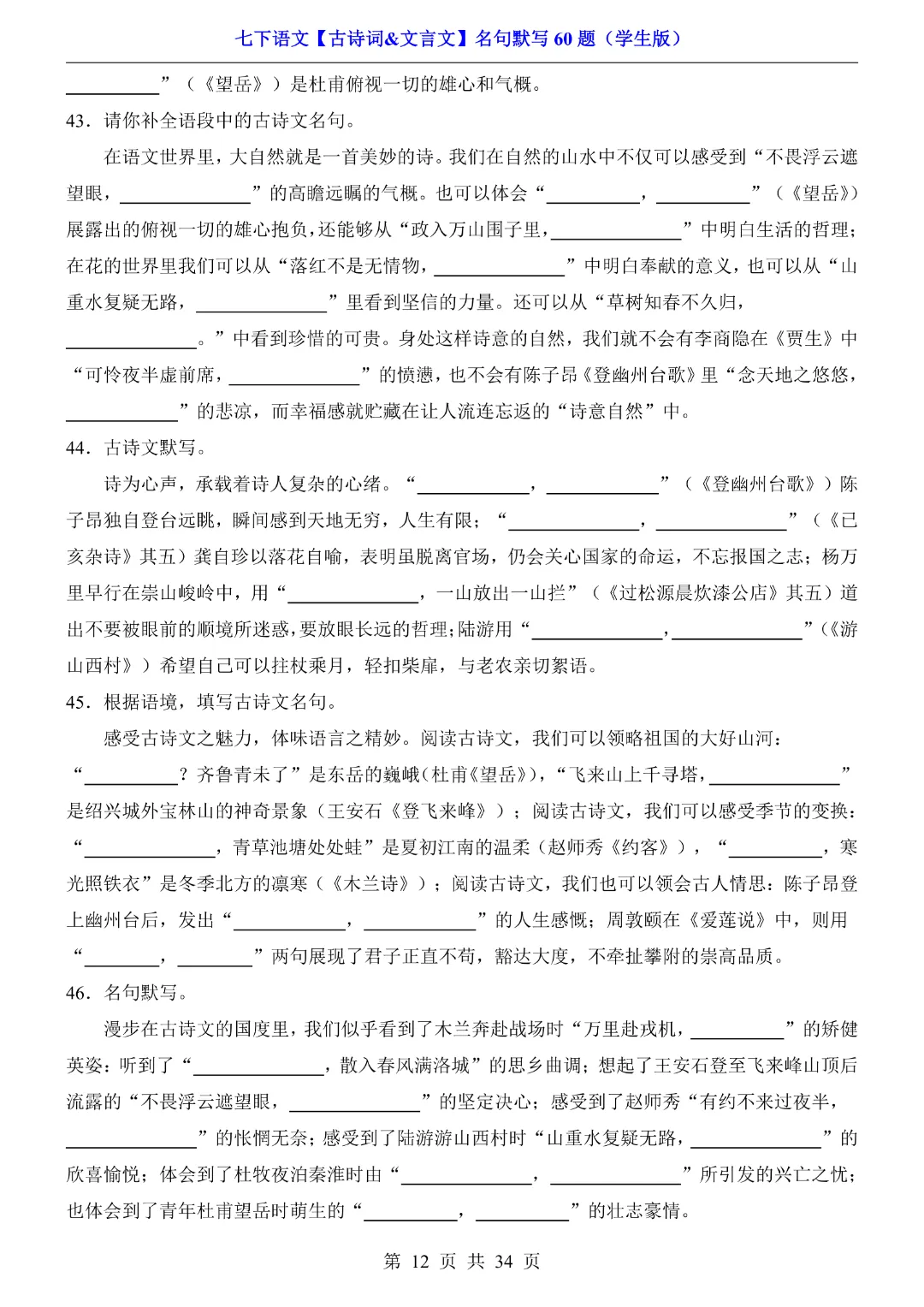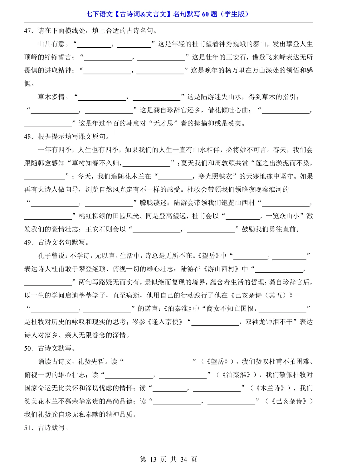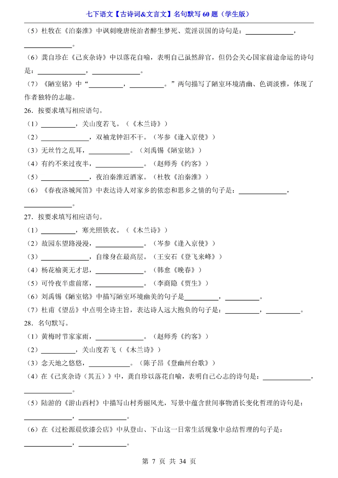 今天给大家分享的是:【七年级下册语文】【人教部编版】古诗词文言文名句默写训练60题|完整高清电子版可打印
