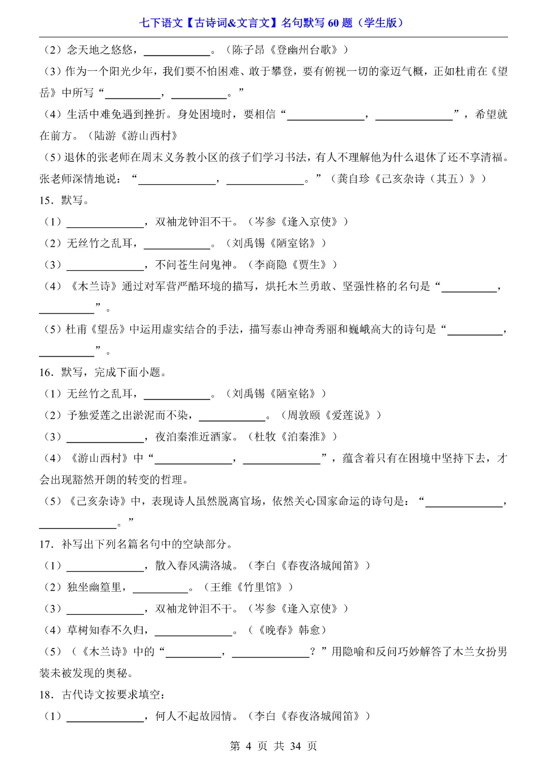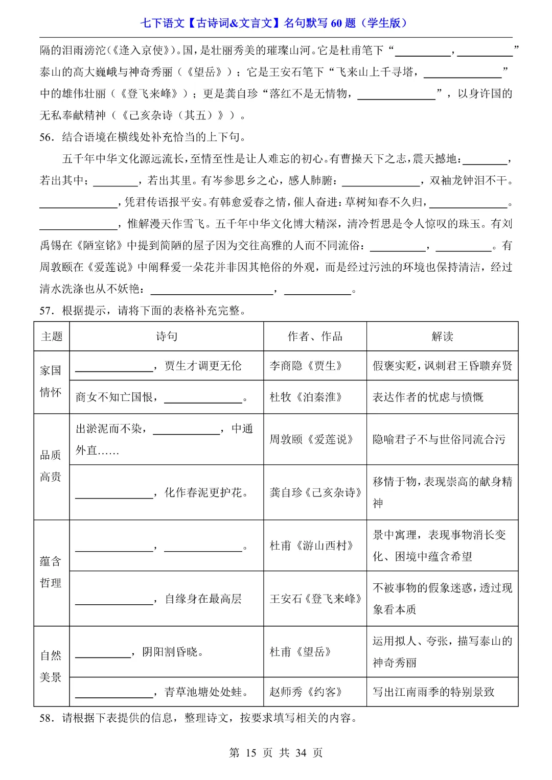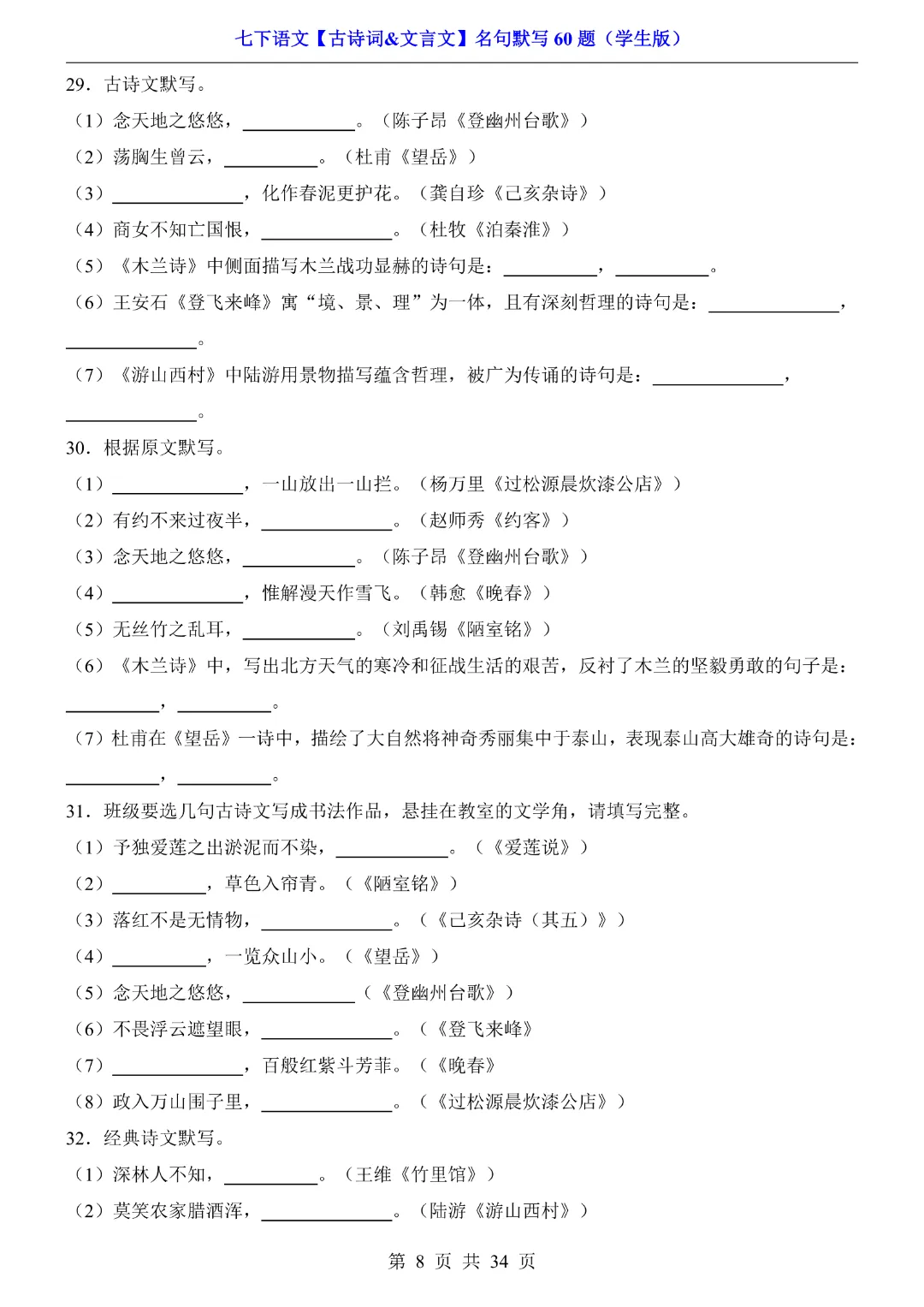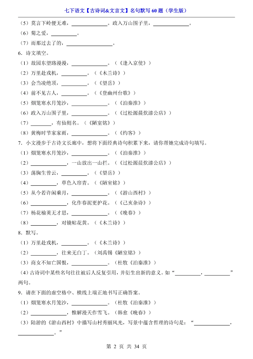 今天给大家分享的是:【七年级下册语文】【人教部编版】古诗词文言文名句默写训练60题|完整高清电子版可打印