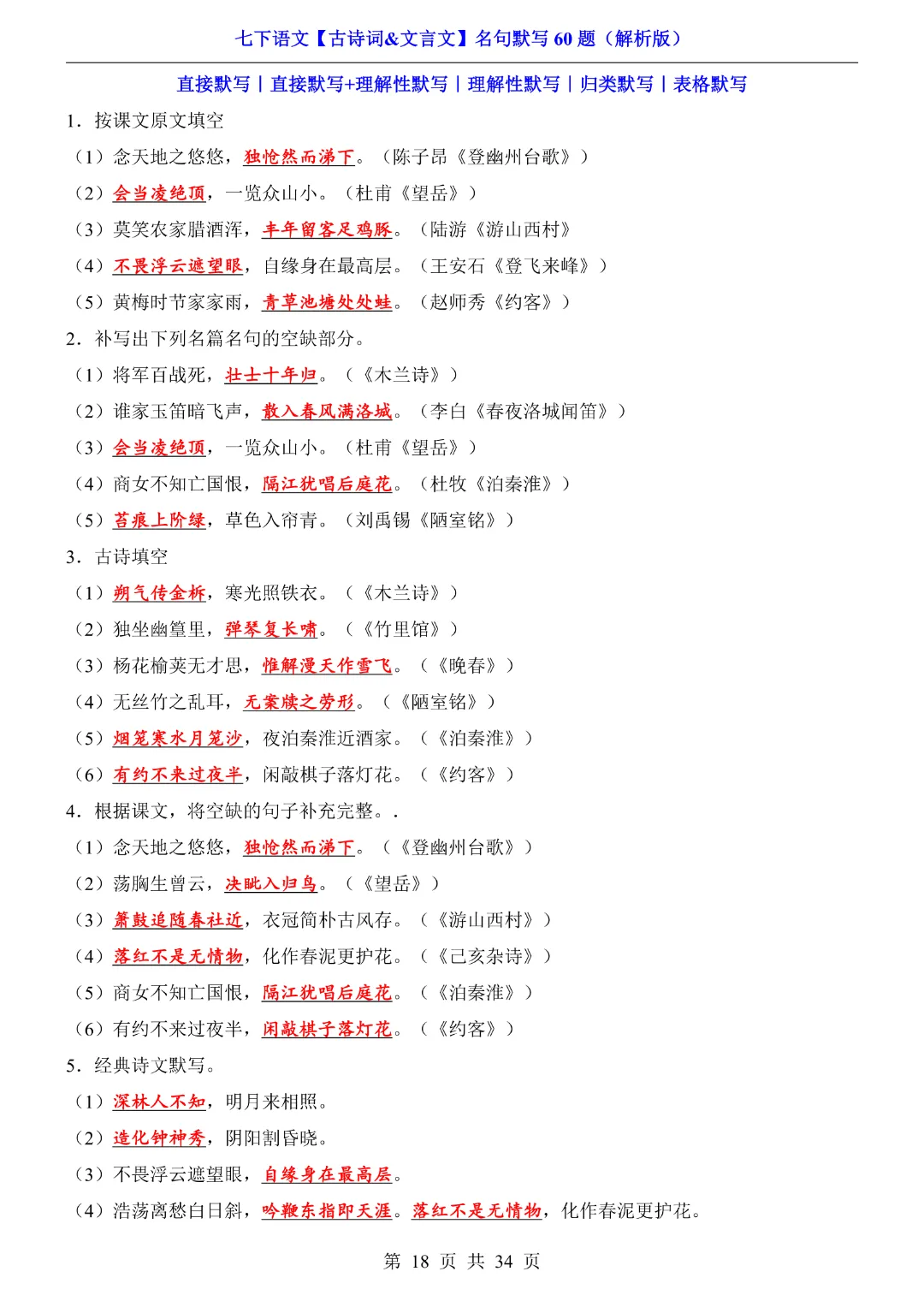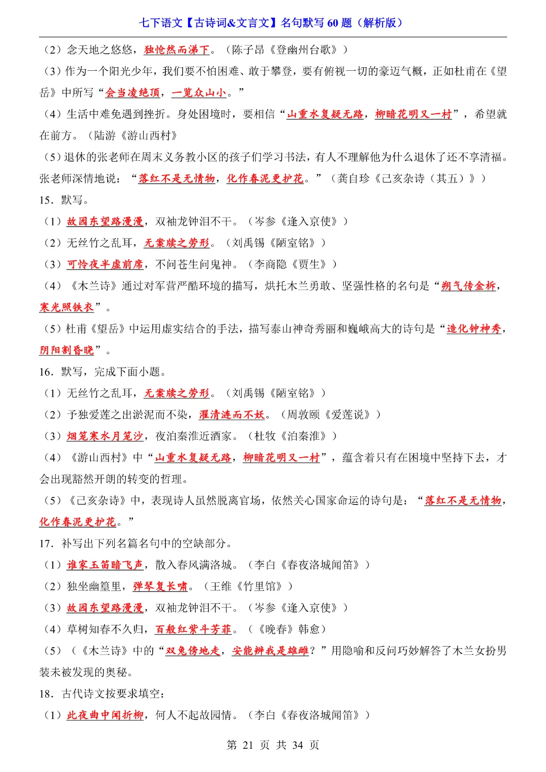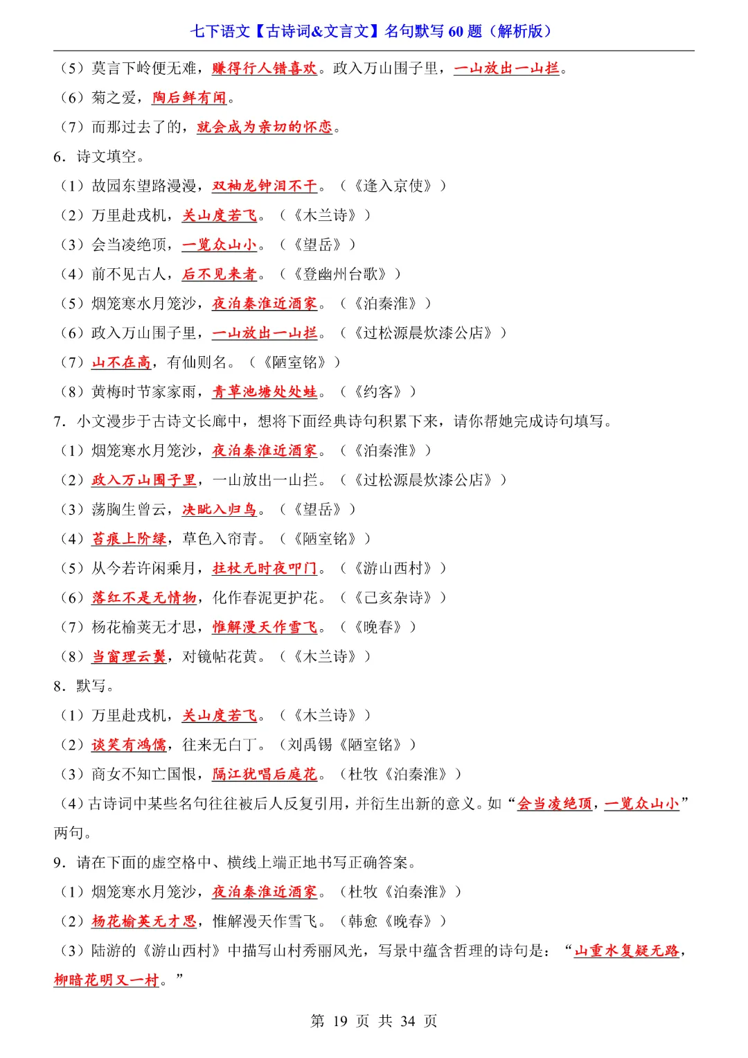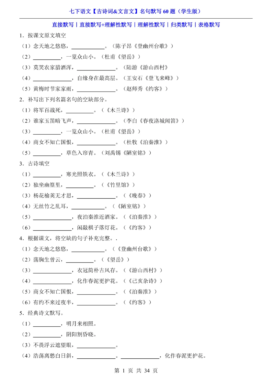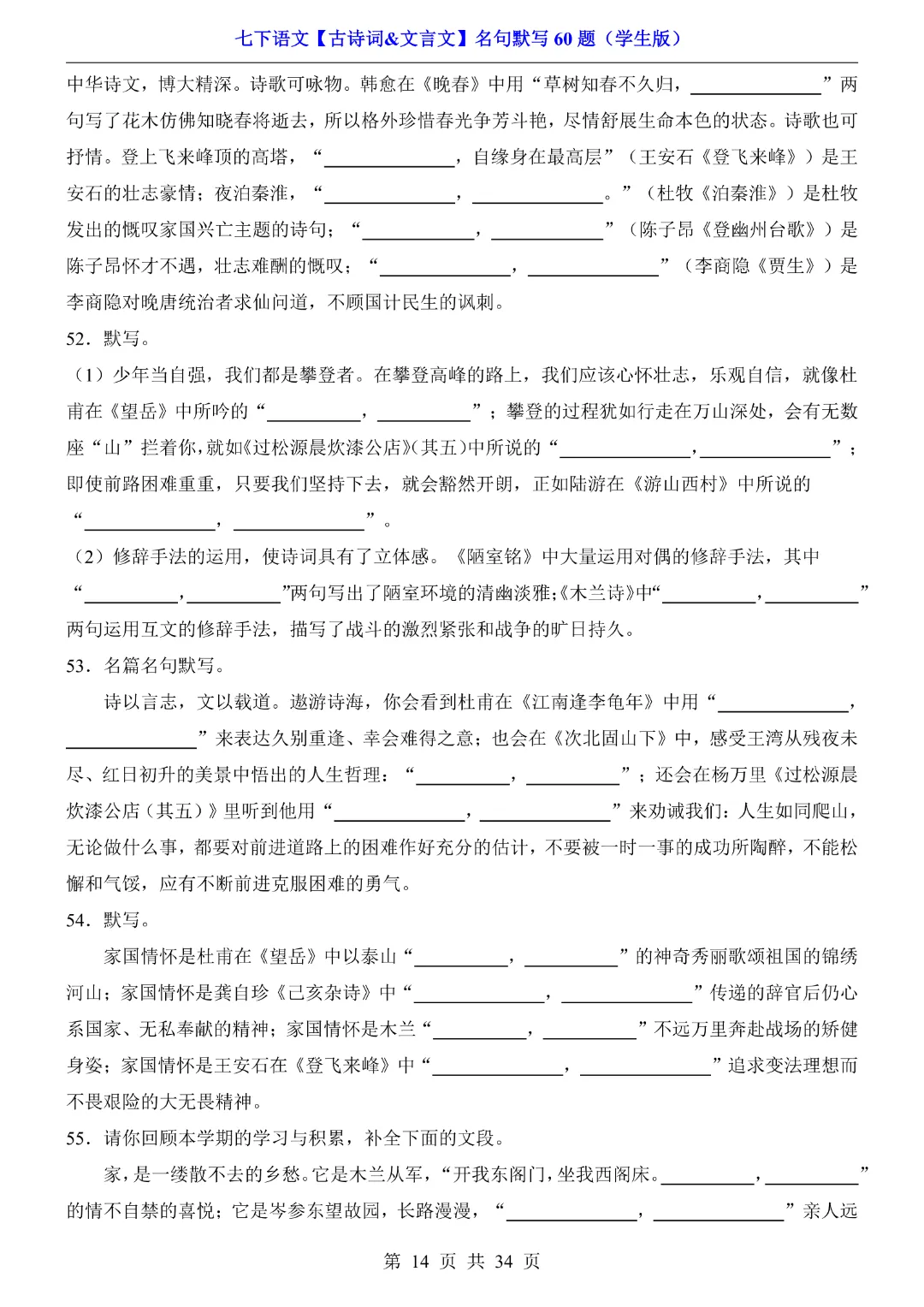 今天给大家分享的是:【七年级下册语文】【人教部编版】古诗词文言文名句默写训练60题|完整高清电子版可打印